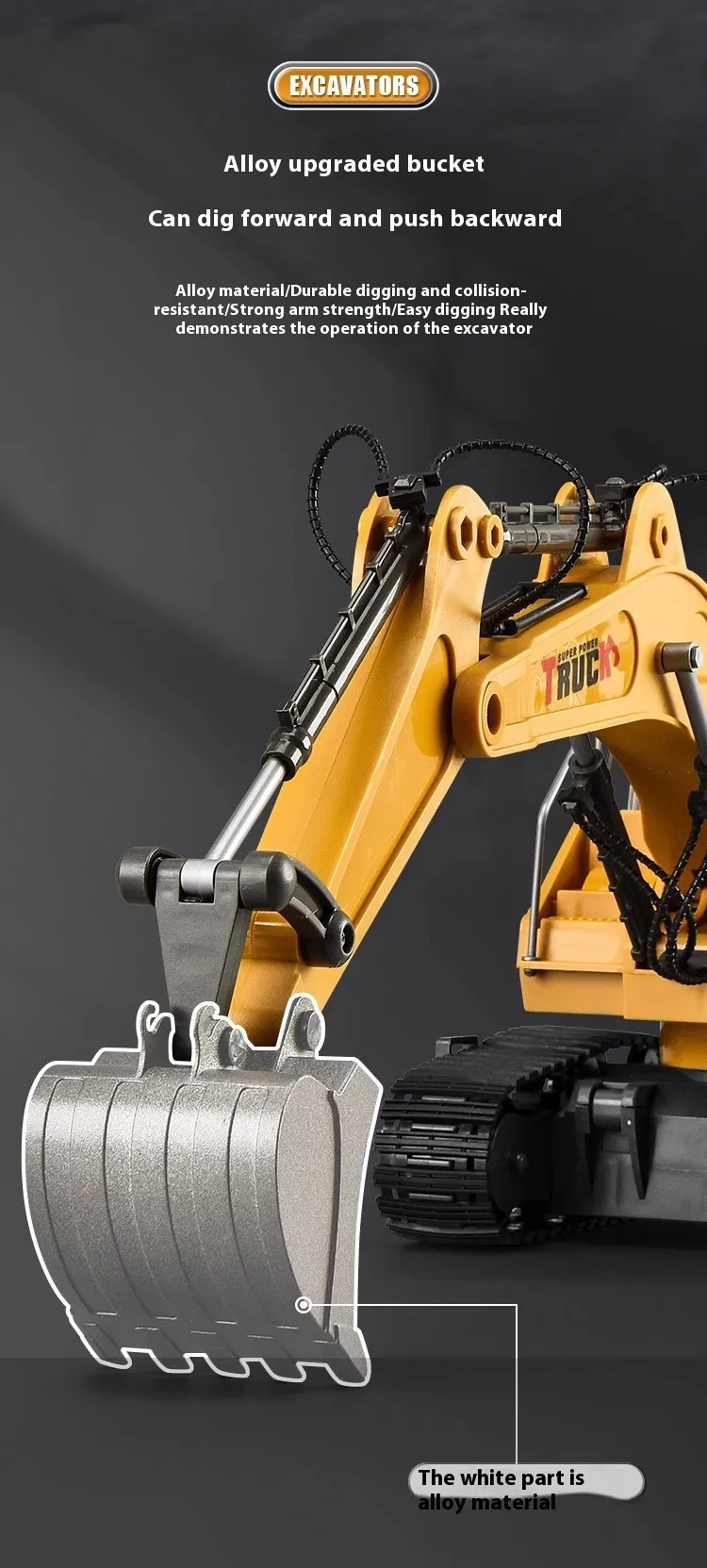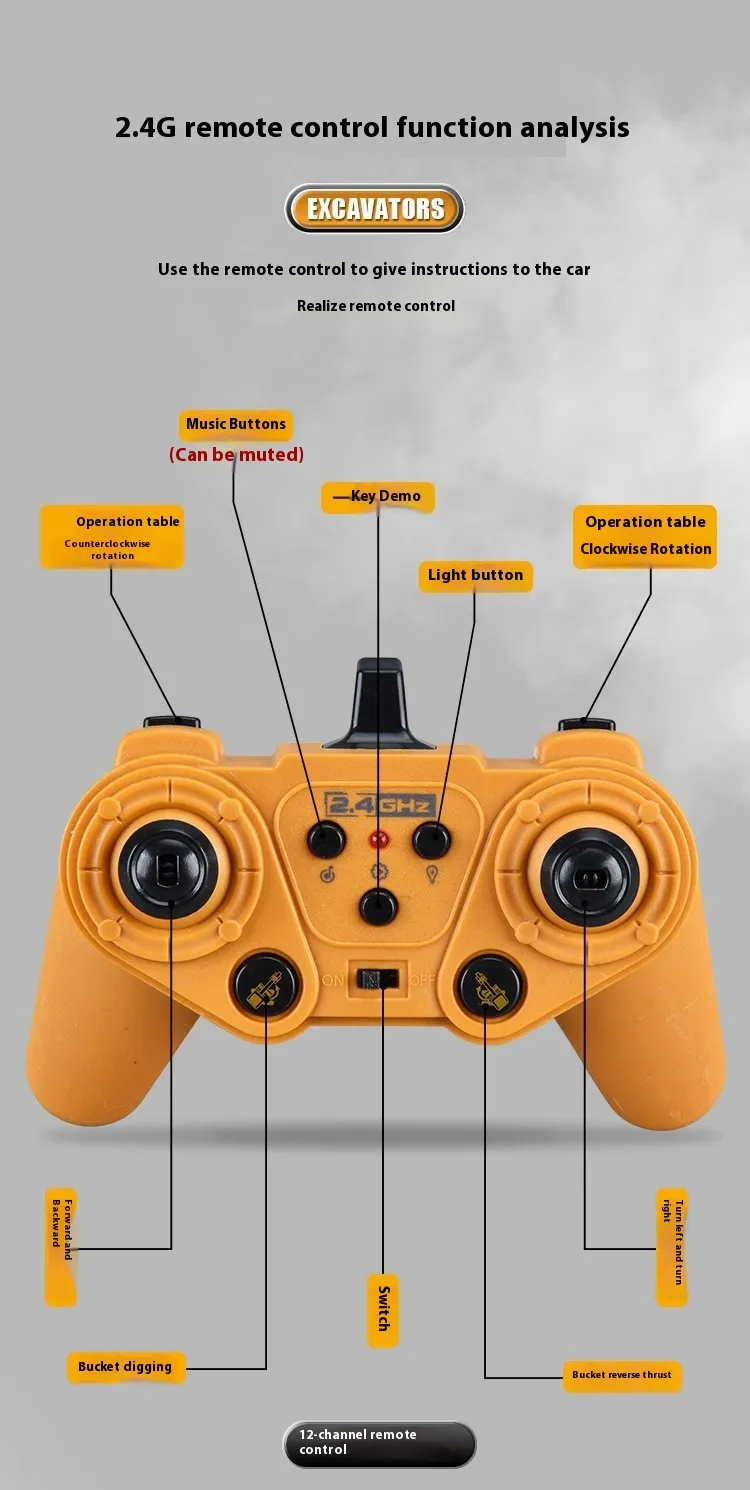 Crafted from high-quality alloy and non-toxic ABS plastic, the excavator car is sturdy, impact-resistant, and safe for children. The strong build ensures it can handle bumps, scrapes, and outdoor play. The 2.4GHz remote-control system provides smooth operation, allowing kids to move the excavator forward, backward, left, right, and control its digging arm just like a real construction vehicle.