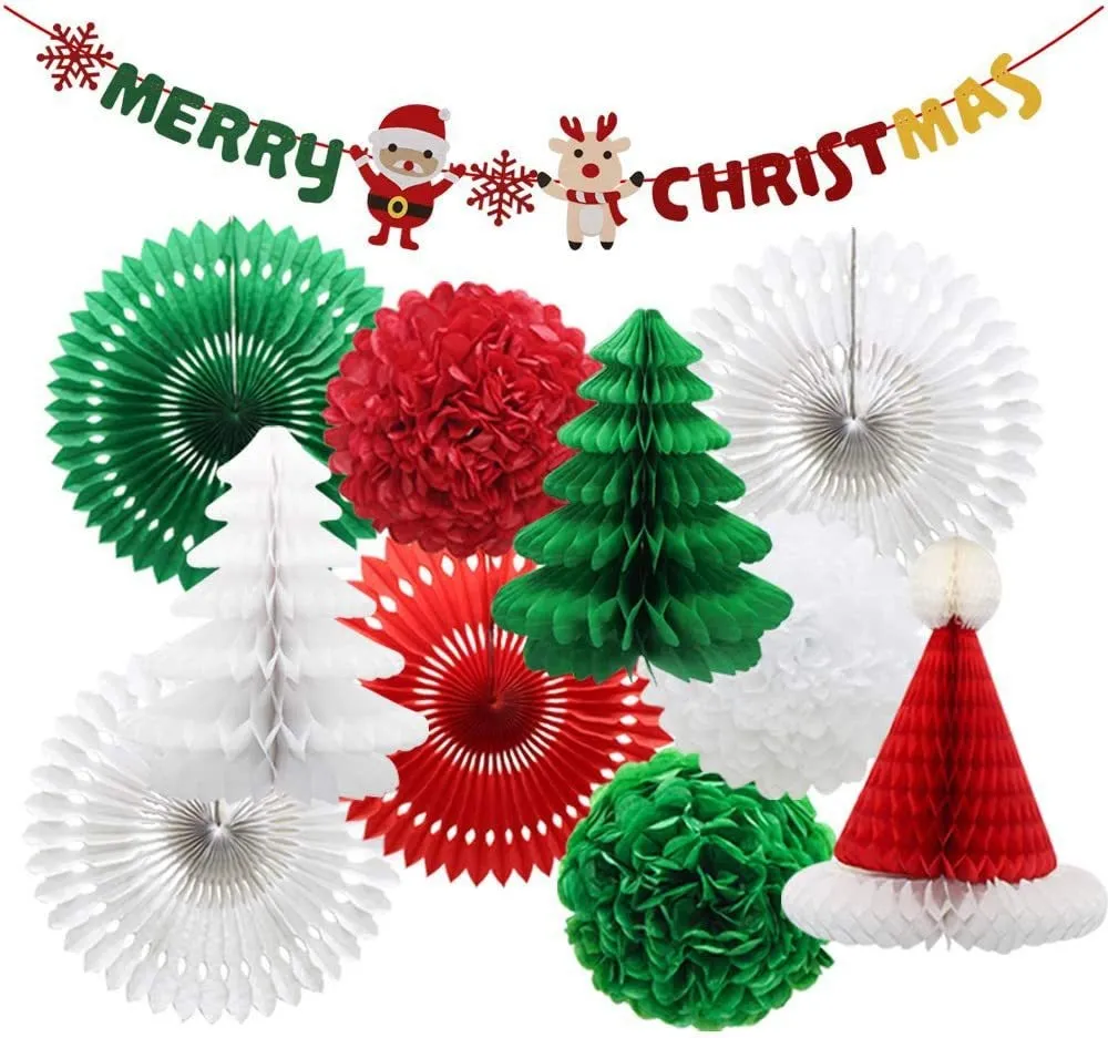Includes honeycomb balls, Santa hats, hanging pendants, letter flags, spiral streamers, and festive latte-art tools.