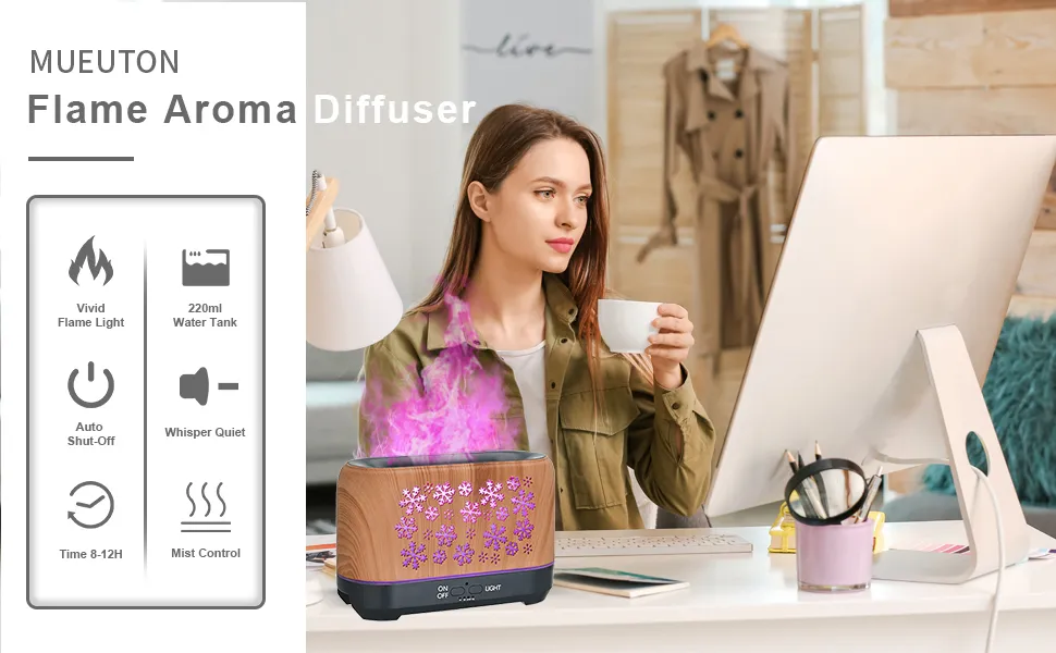2.【220ML & WATERLESS AUTO-OFF】: The flame diffuser with 220ml water tank allows you to humidify continuously for up to 15 hours.no water