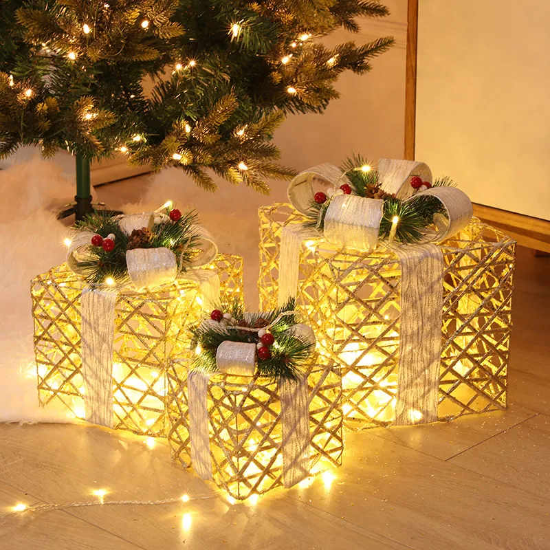 Product Description for Christmas Wrought Iron Gift Box Warm White Christmas Ornament Three-Piece Set With Battery Box