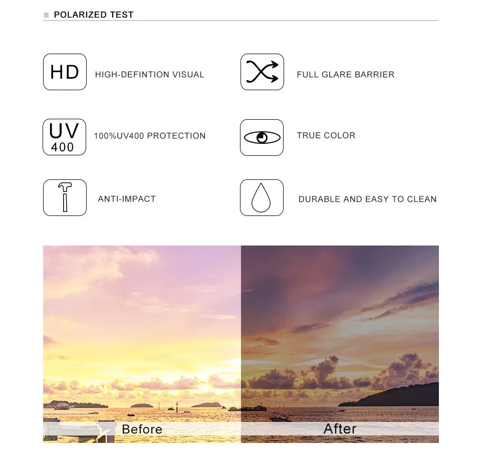 - Lens: UV400 protection with options for polarized or tinted lenses