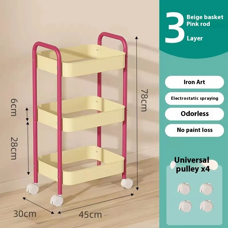 carbon steel beige basket red Rod trolley, 3-layer carbon steel beige basket pitaya powder rod hand push, 3-layer pink carbon steel White