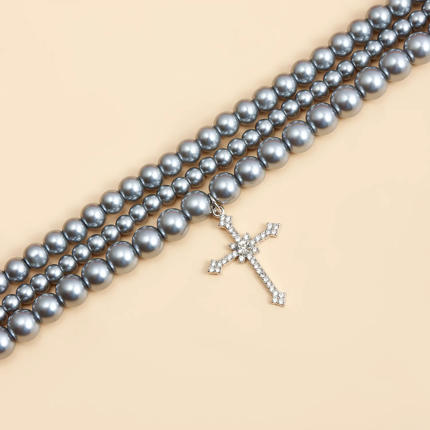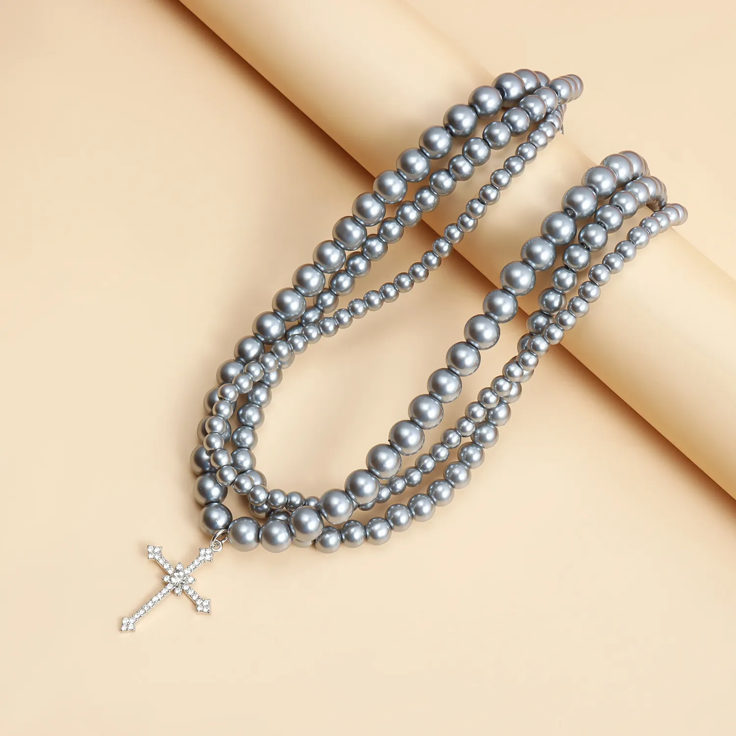 The necklace’s multi-layered construction includes a clavicle chain, painted glass beads, and a stunning diamond-encrusted cross pendant. This layered effect creates depth and visual appeal, making it a statement piece for any outfit.