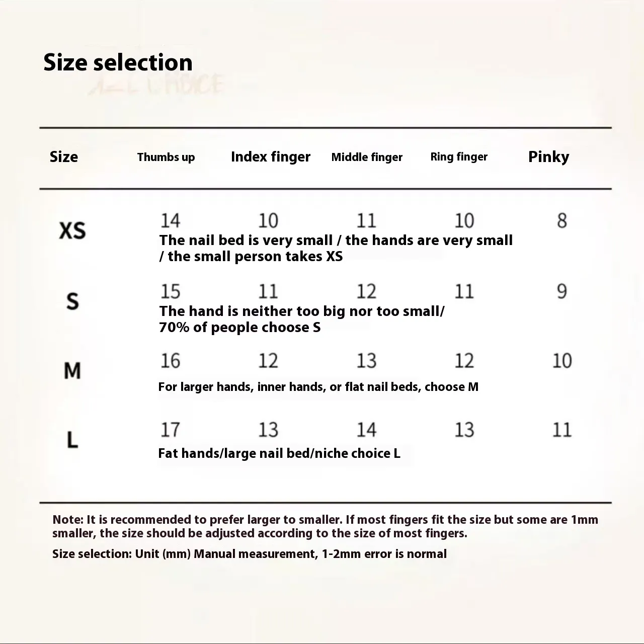Color classification: extra small XS, small size S, medium M, large L