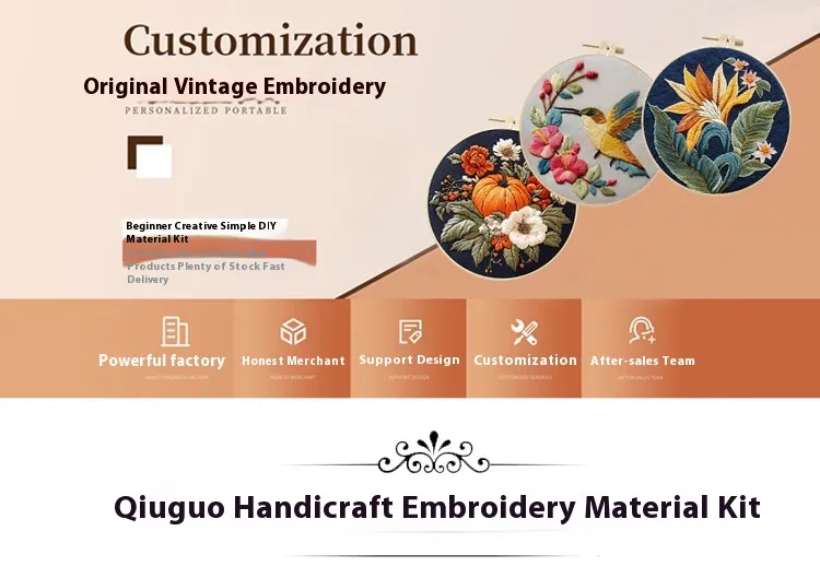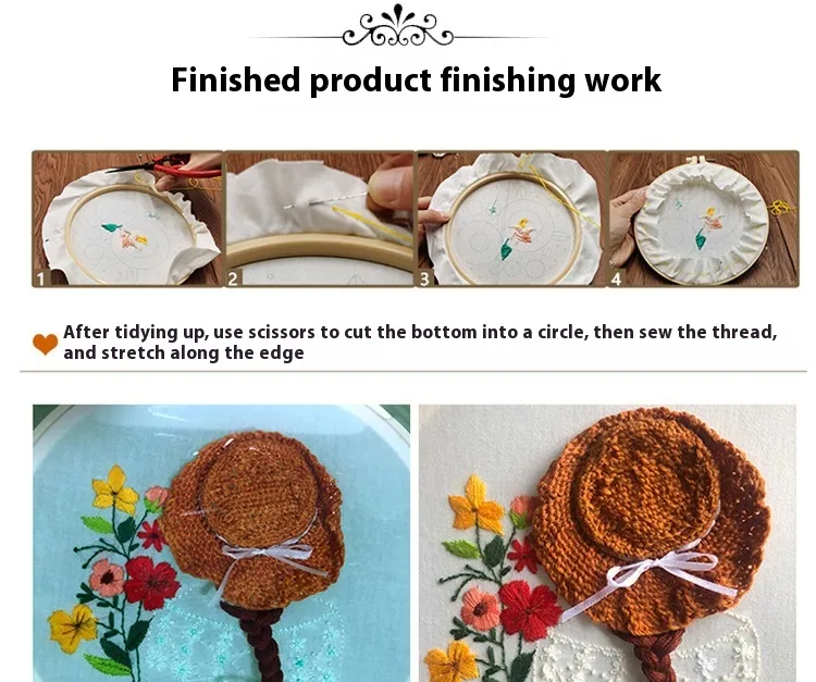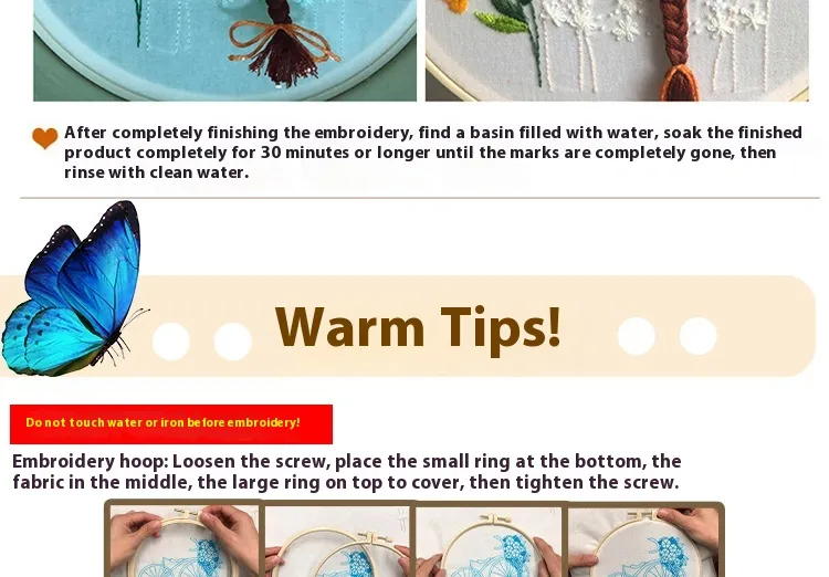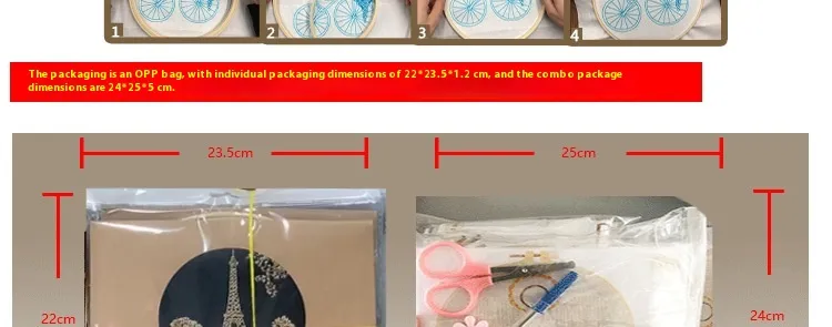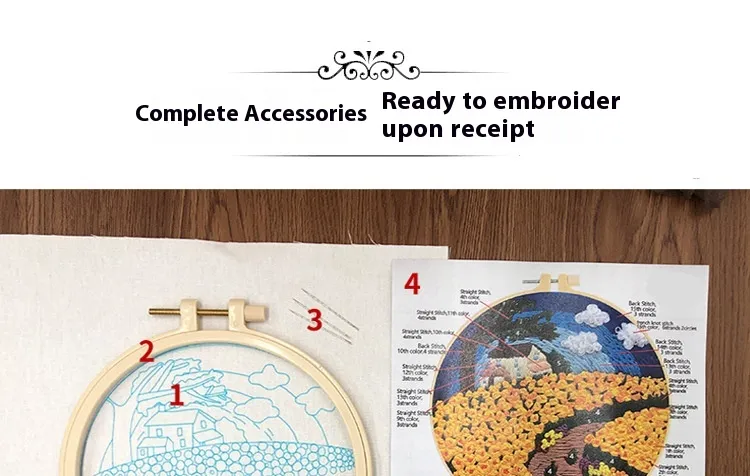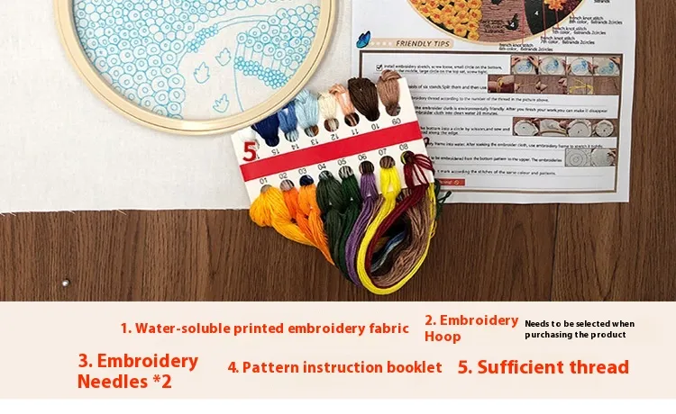 Complete set of accessories: Disposable printed embroidery fabric * 1, sufficient thread * 1, English graphic instructions and drawings * 1,