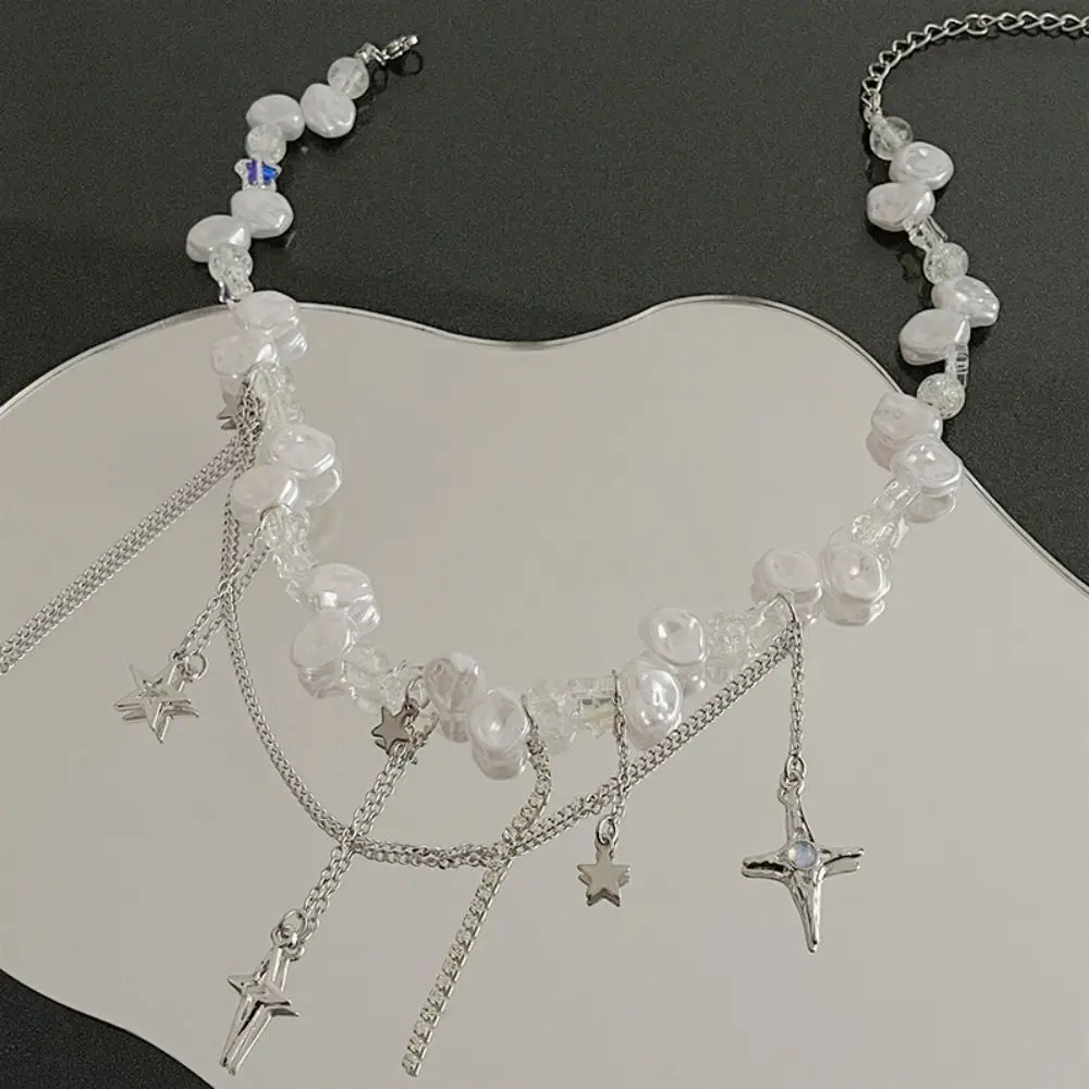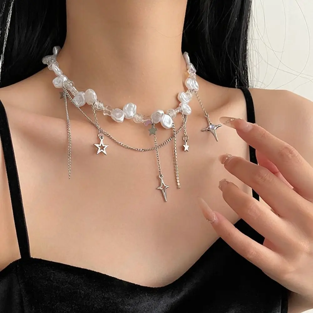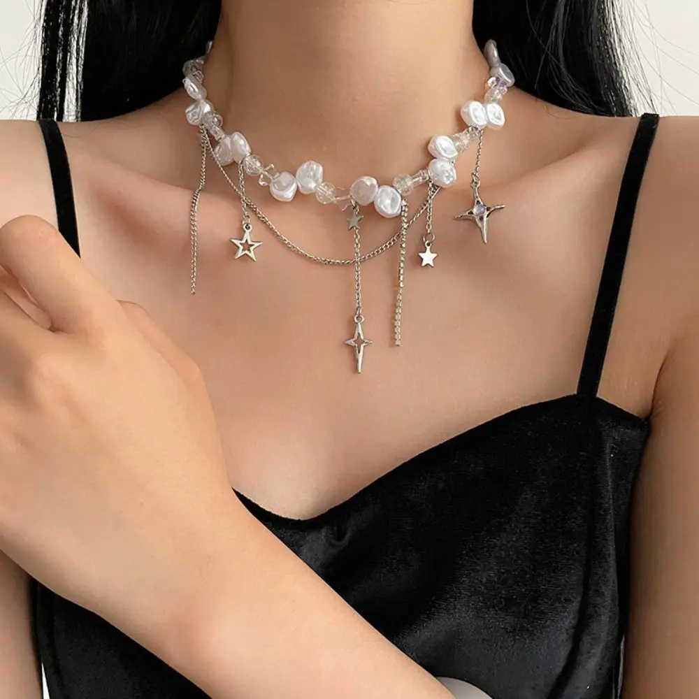 The Collar Bone Baroque Pearl Choker Necklace is a bold and trendy accessory designed for modern women who love making a statement. Featuring a unique mix of baroque pearls, colorful beads, and whimsical star accents, this choker is the perfect combination of elegance and hipster fashion. With its overlay pearl chain design, this necklace sits gracefully on the collarbone, adding a touch of playfulness and sophistication to any outfit.