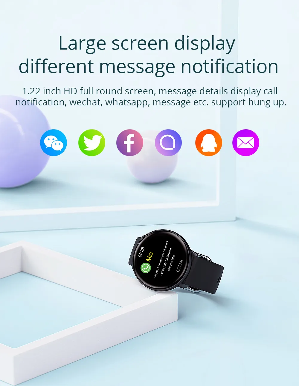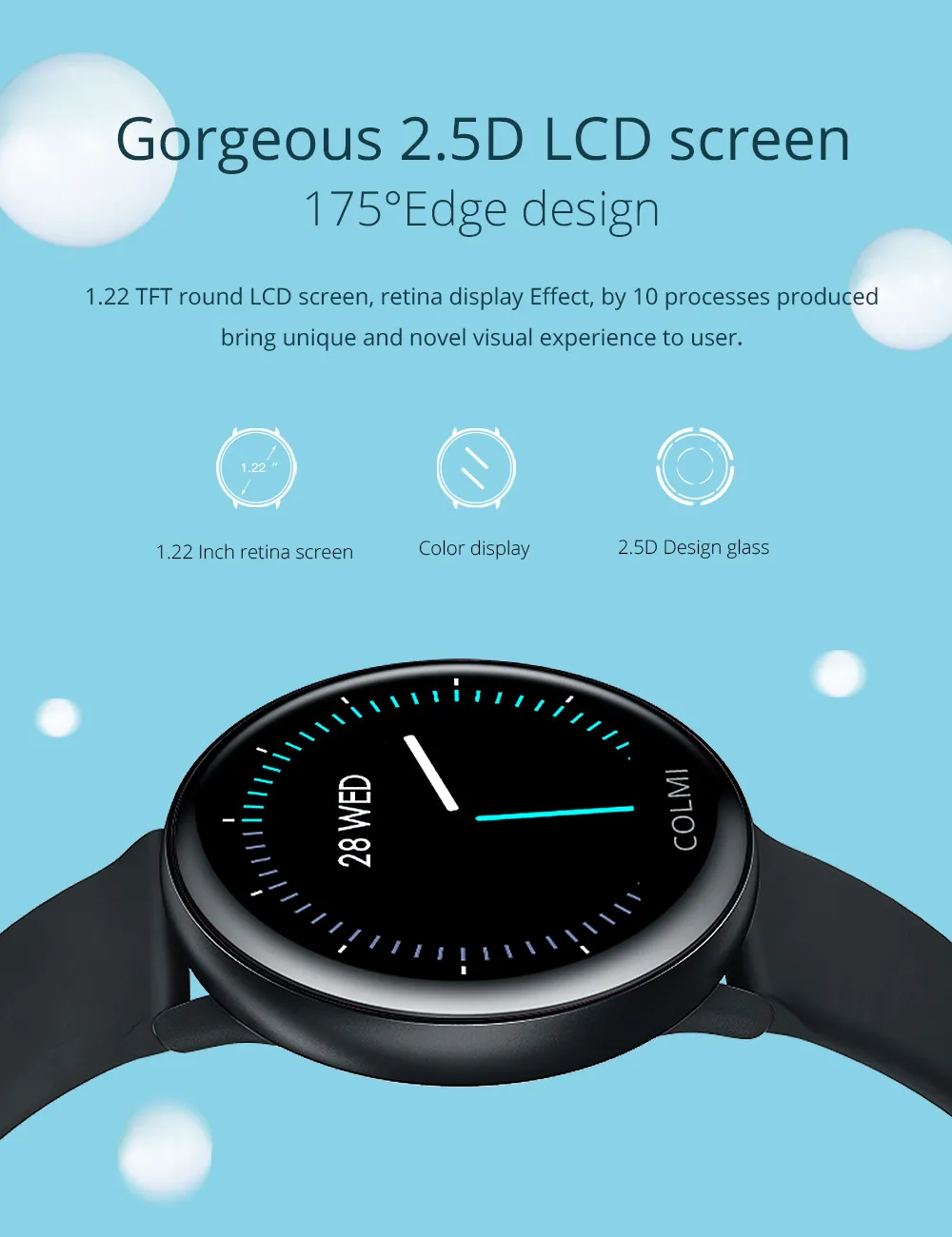 The COLMI SKY2 is equipped with a 1.22-inch color touchscreen display, providing clear visibility of notifications, health metrics, and fitness data. The responsive touch interface ensures easy navigation through various features and settings.​