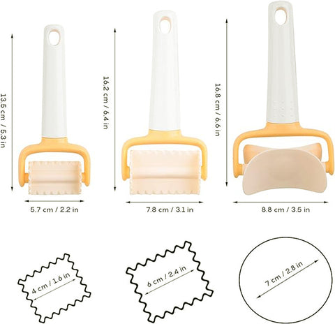 A 3 piece set of rolling mold that comes in 3 different classic shapes, including round, medium crimped square, and large