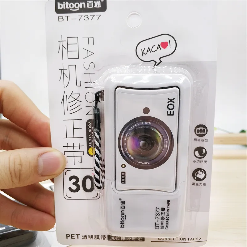 - Fun, cartoon camera design – A playful and unique take on standard correction tapes.