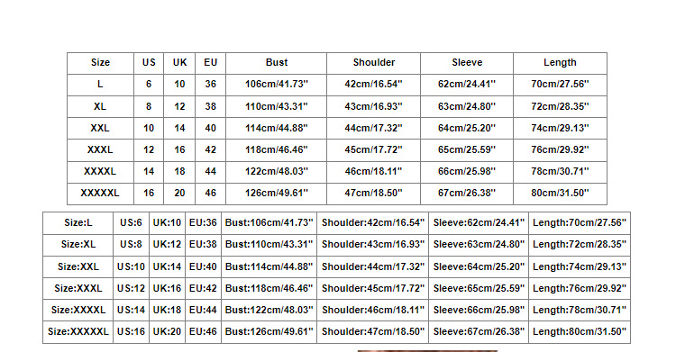 Note:1. Asian sizes are 1 to 2 sizes smaller than European and American people. Choose the larger size if your size is between two sizes. Please allow 2-3cm differences due to manual measurement. 2. Please check the size chart carefully before you buy the item, if you don't know how to choose a size, please contact our customer service. 3. As you know, the different computers display colors differently, the color of the actual item may vary slightly from the following images