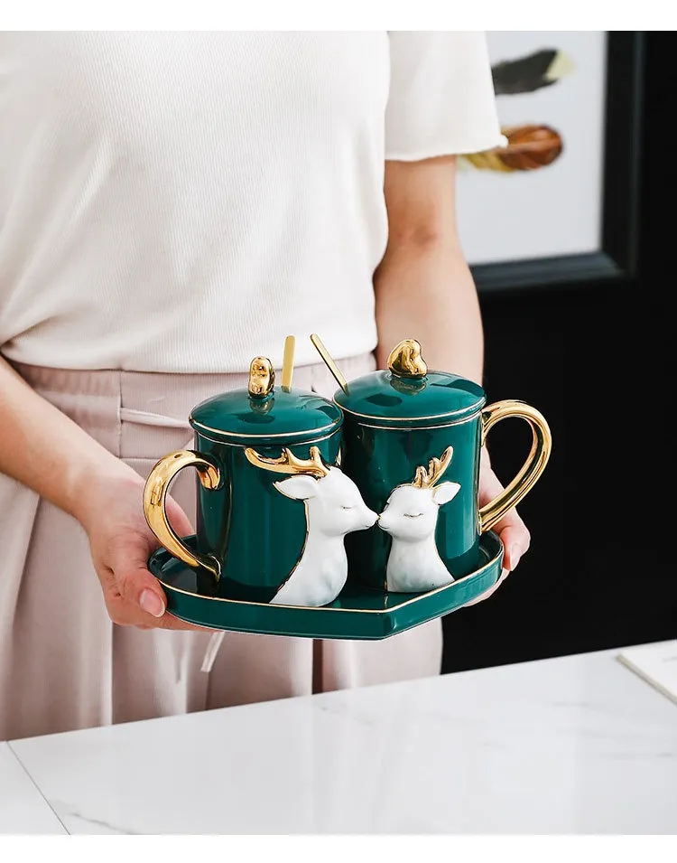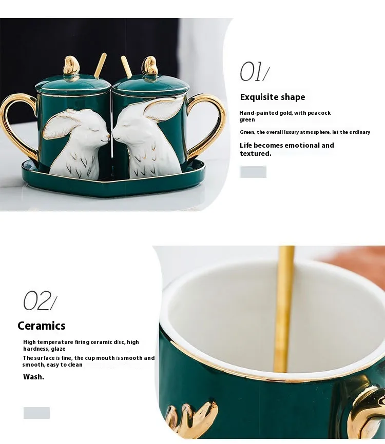 Color: A deer with couple's cups (2 spoons with lid and 1 plate gift box), kissing rabbit couple's cups (2 spoons with lid and 1 plate gift