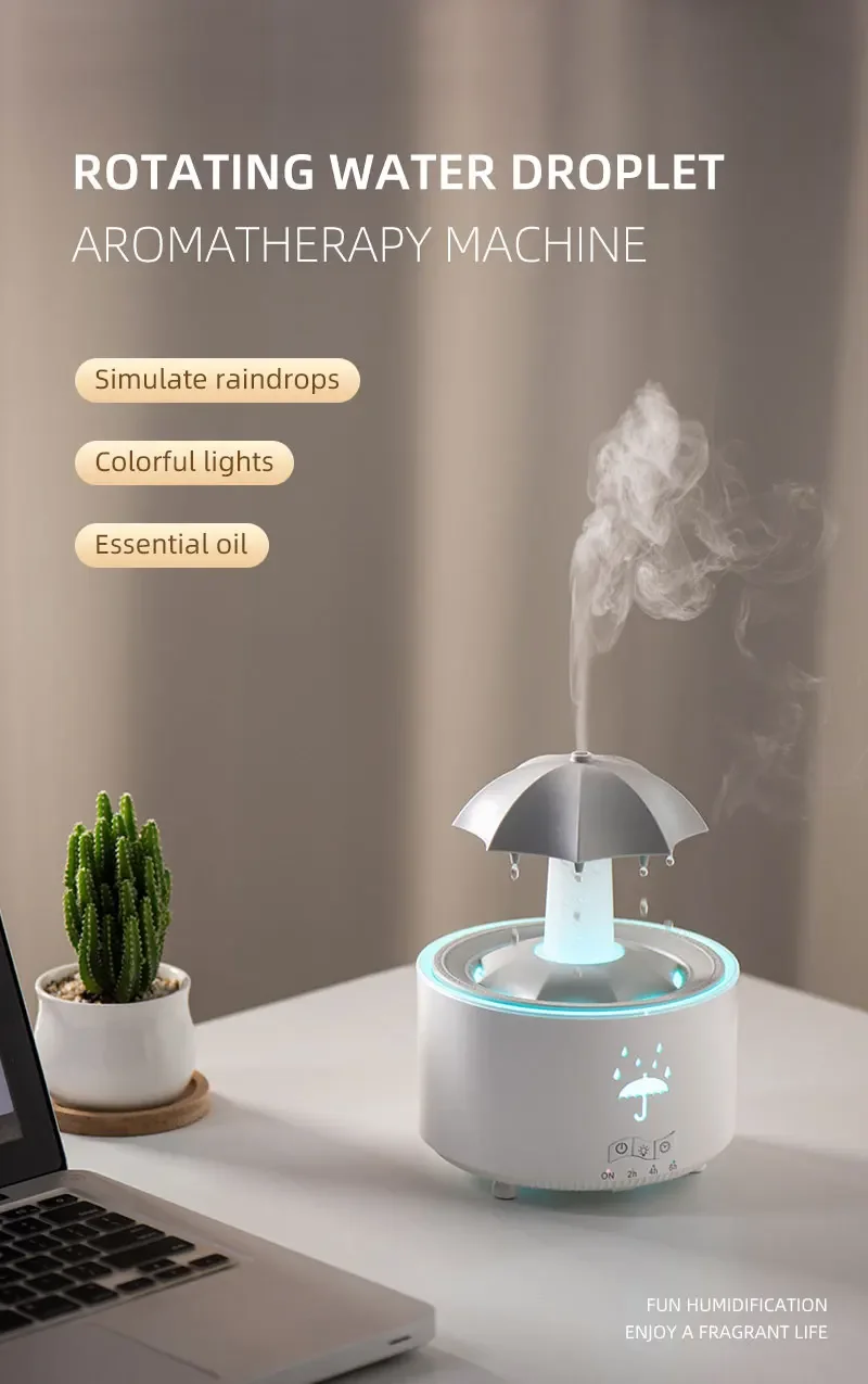 - RAIN HUMIDIFIER WITH REMOTE & TIMER: Enjoy complete convenience with the included remote control. Change the color and rotation settings without leaving your comfy spot. You can also set the 2h, 4h, 8h timer function for the air humidifier. 300ML capacity of rain diffuser can be used continuously for 24-26 hours. Water drip humidifier will automatically shut off once the water runs out.