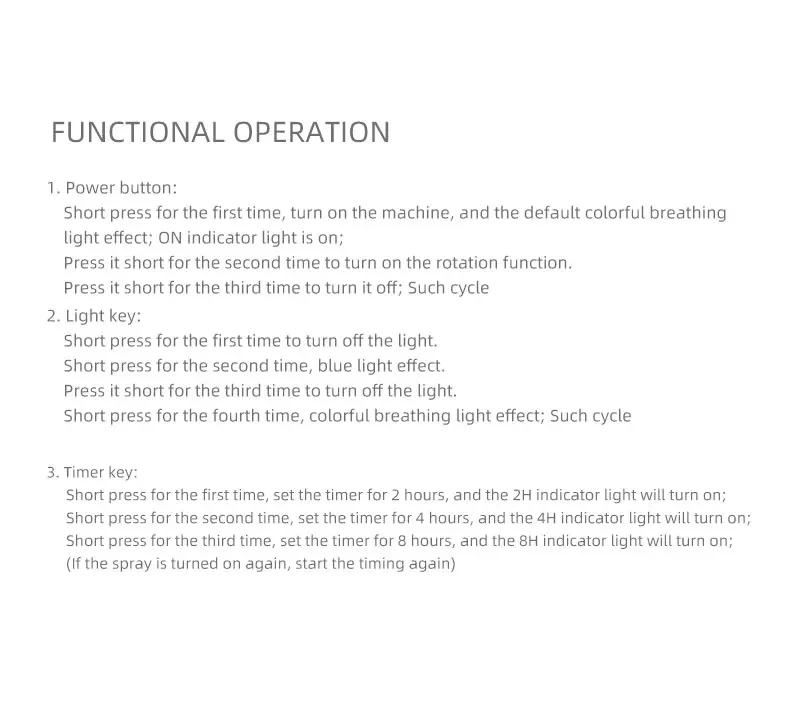 -Short press for the third time, set the timer for 8 hours, and the 8H indicator light will turn on;(lf the spray is turned on again, start the timing again)
