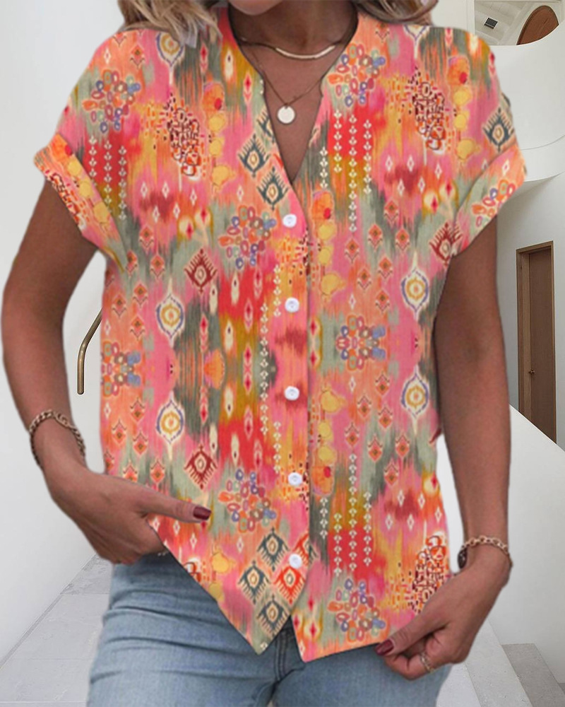 Cross-border European And American Printed Button V-neck Short-sleeved Top Women's Clothing