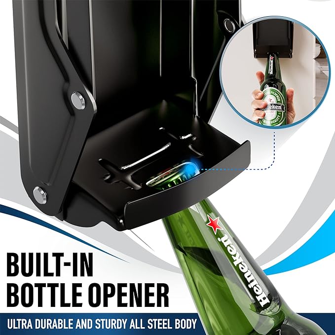 - DESIGN: Easy and safe soft grip pull down tool completely compresses the metal to approximately 20% of original size saving precious storage space – Bonus bottle opener is located at bottom of tool for easy access - Vertically installs onto wall studs with included screws.