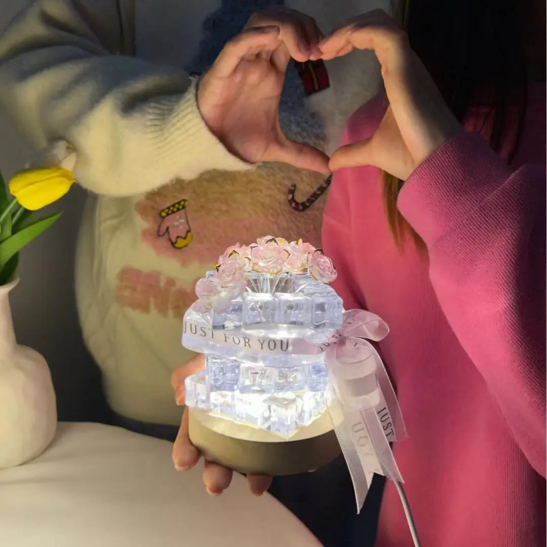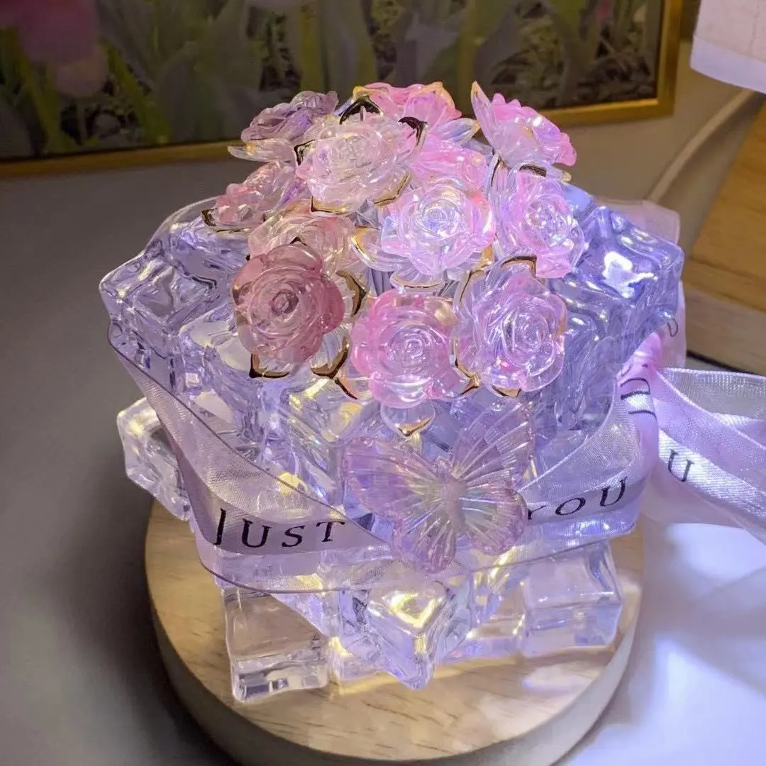 This exquisite night lamp captures the beauty of roses in a contemporary cube shape, making it a striking decorative piece.