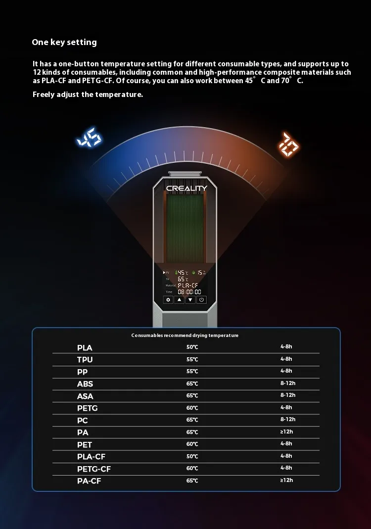 With adjustable temperature settings, the drying box is suitable for a variety of filaments, including PLA, ABS, PETG, TPU, and more, making it a versatile addition to your 3D printing setup.