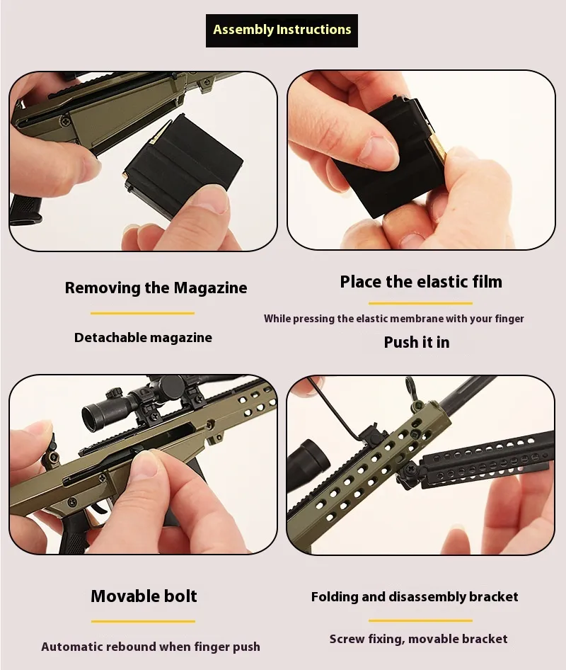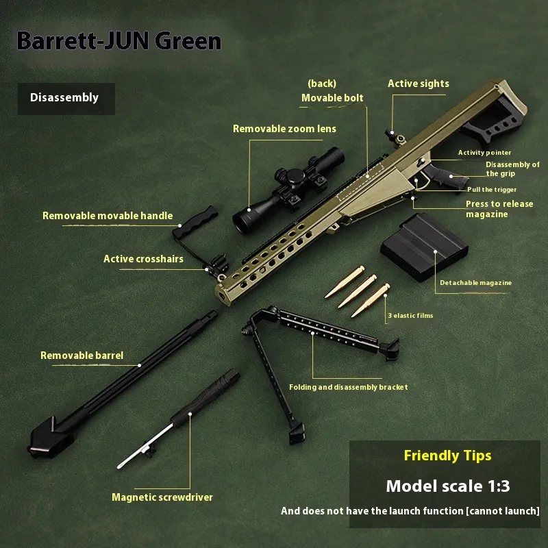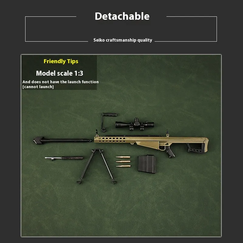 The Detachable Barrett M82A1 Sniper Rifle Toy is a meticulously crafted, highly detailed model of the iconic Barrett M82A1 sniper rifle. Designed with precision and realism in mind, this toy offers an immersive experience for military enthusiasts, collectors, and fans of high-quality model guns. Its detachable components and authentic design make it a must-have addition to any collection, combining durability with an interactive, hands-on element.