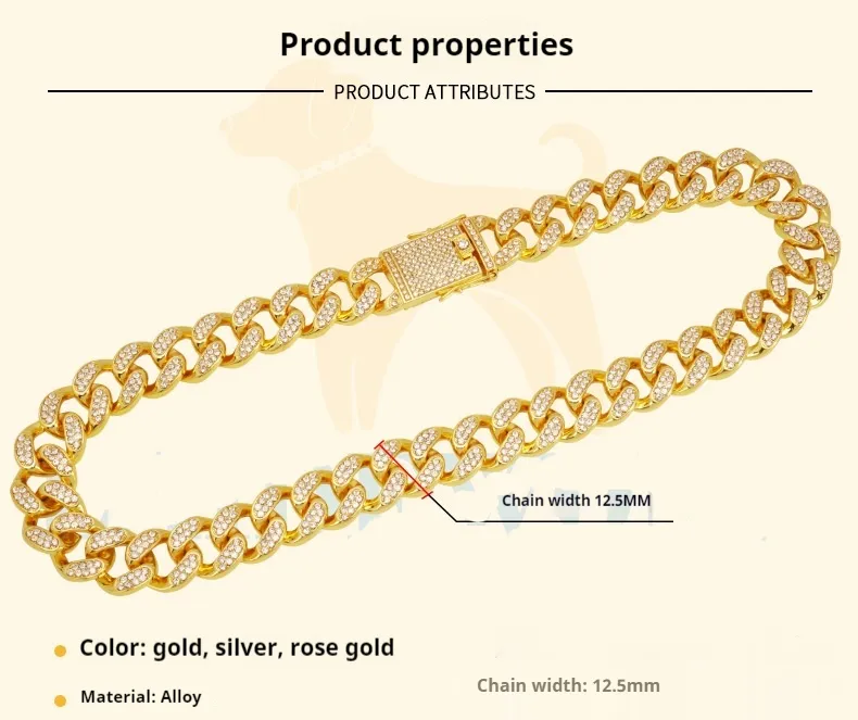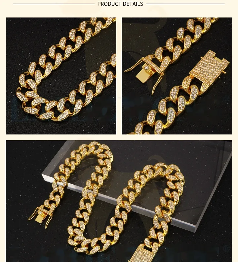 A Diamond Cuban Link Dog Collar is a premium, high-end accessory designed to give your dog a bold, fashionable look while ensuring durability and comfort. Inspired by the classic Cuban link chain style often seen in luxury jewellery, this collar is crafted with thick, interlocking links that provide strength and visual appeal.