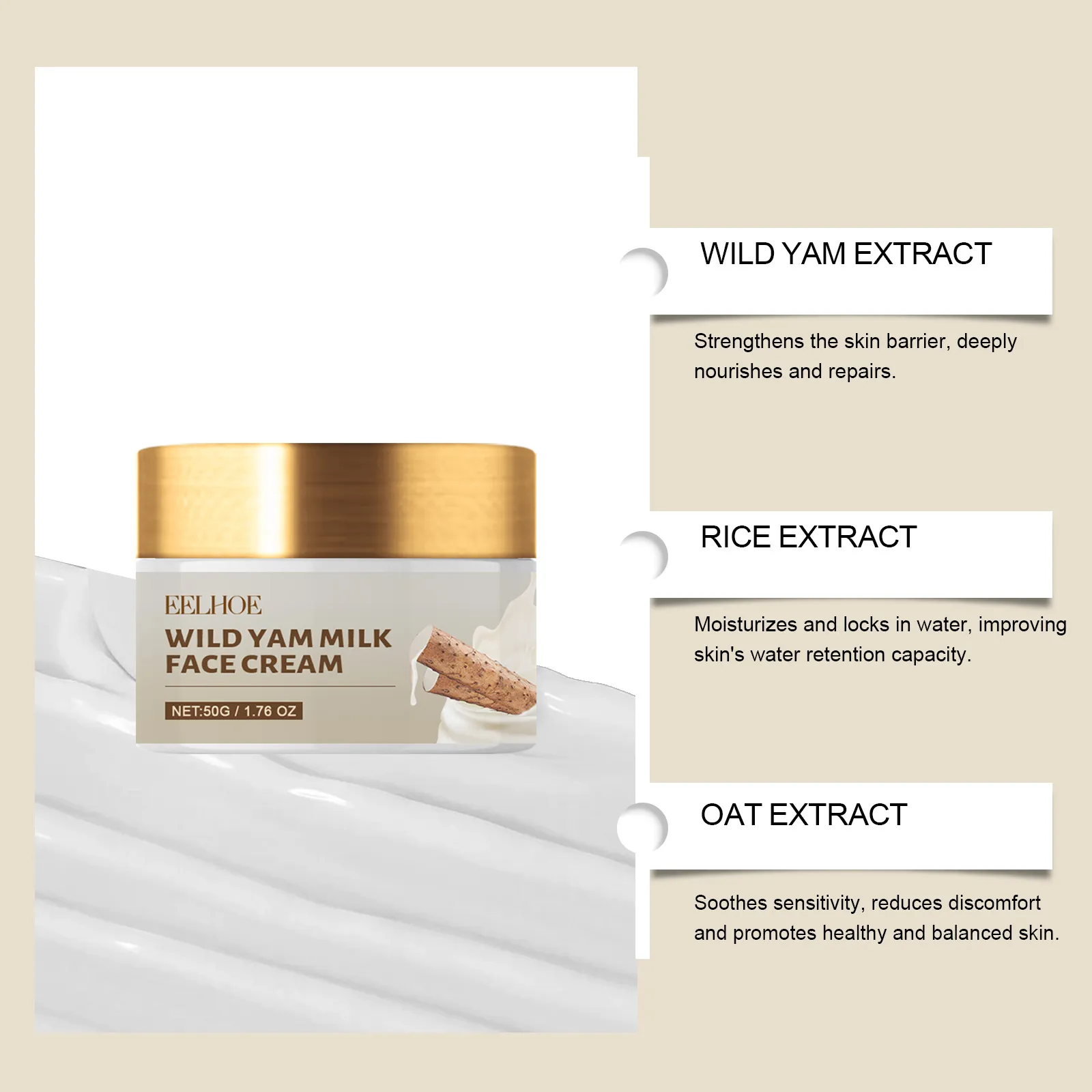 This moisturizing cream contains Dioscorea Japonica root extract, renowned for its antioxidant and anti-inflammatory benefits, helping to reduce skin irritation and protect against environmental damage. Additionally, rice and oat extracts provide further hydration, while milk proteins support skin renewal and smoothness.