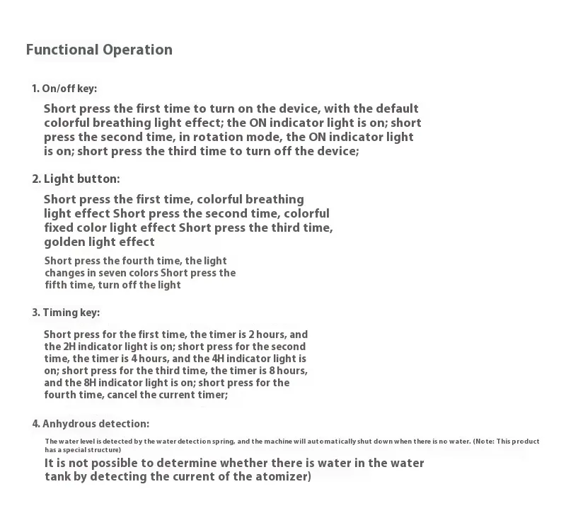 for 2 hours;Press it short for the second time for 4 hours, and the 4-hour indicator light will be on;Press it short for the third time for 8 hours, and the 8-hour indicator will light up;Short press for the fourth time to cancel the current timing;