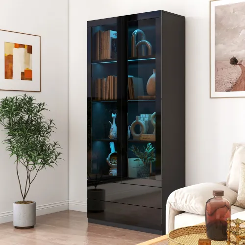 Product Name:Display Cabinet with Glass Doors, Curio Storage Cabinet with 2-Drawer, Bookcase with LED Lights, Black