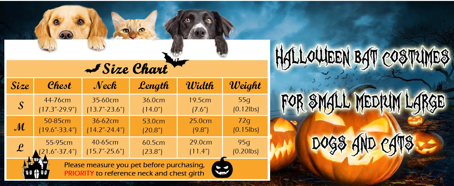 ADJUSTABLE SIZE Chest girth: 50-85cm(19.6-33.4in), Neck girth: 36-62cm(14.2-24.4in). Adjustable Velcro design makes Dog Bat Wings Costume easy to wear. Provides a better fit and more comfort for your pet. Please refer to our size chart and measure the size of your pet before placing the order.