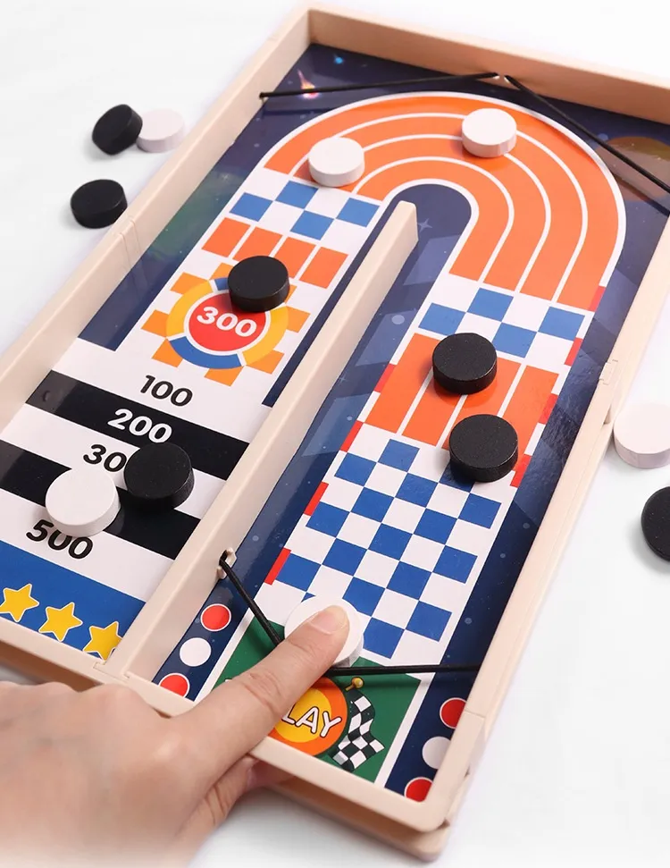 Challenge your friends and family to exciting head-to-head battles! The objective is simple yet thrilling: catapult all your pucks through the center gate to your opponent’s side as quickly as possible. First to clear their side wins!