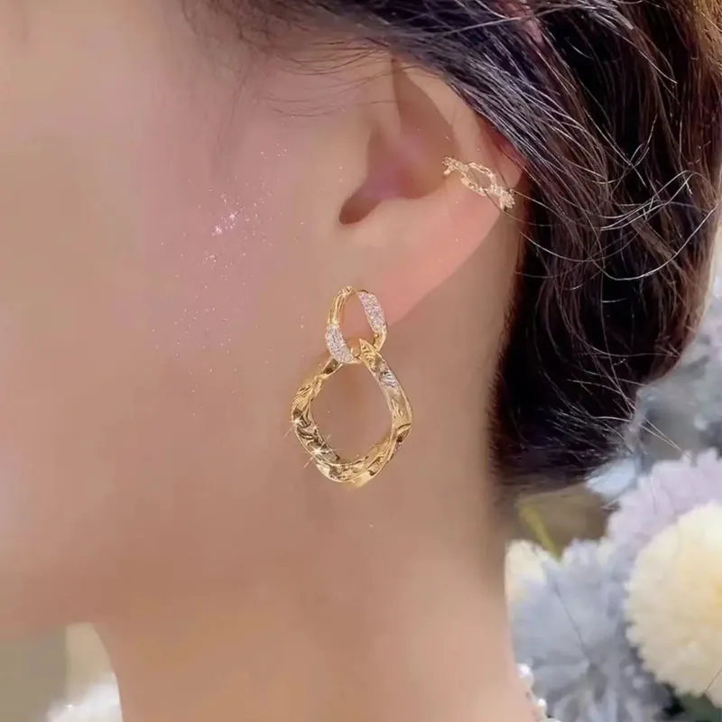 The most striking feature of these earrings is the double-layer ring buckle design. This innovative design combines two overlapping metal rings, creating a visually striking effect that draws attention to the face. The buckle detail adds a modern touch, while the layered design ensures a more dynamic and bold look.