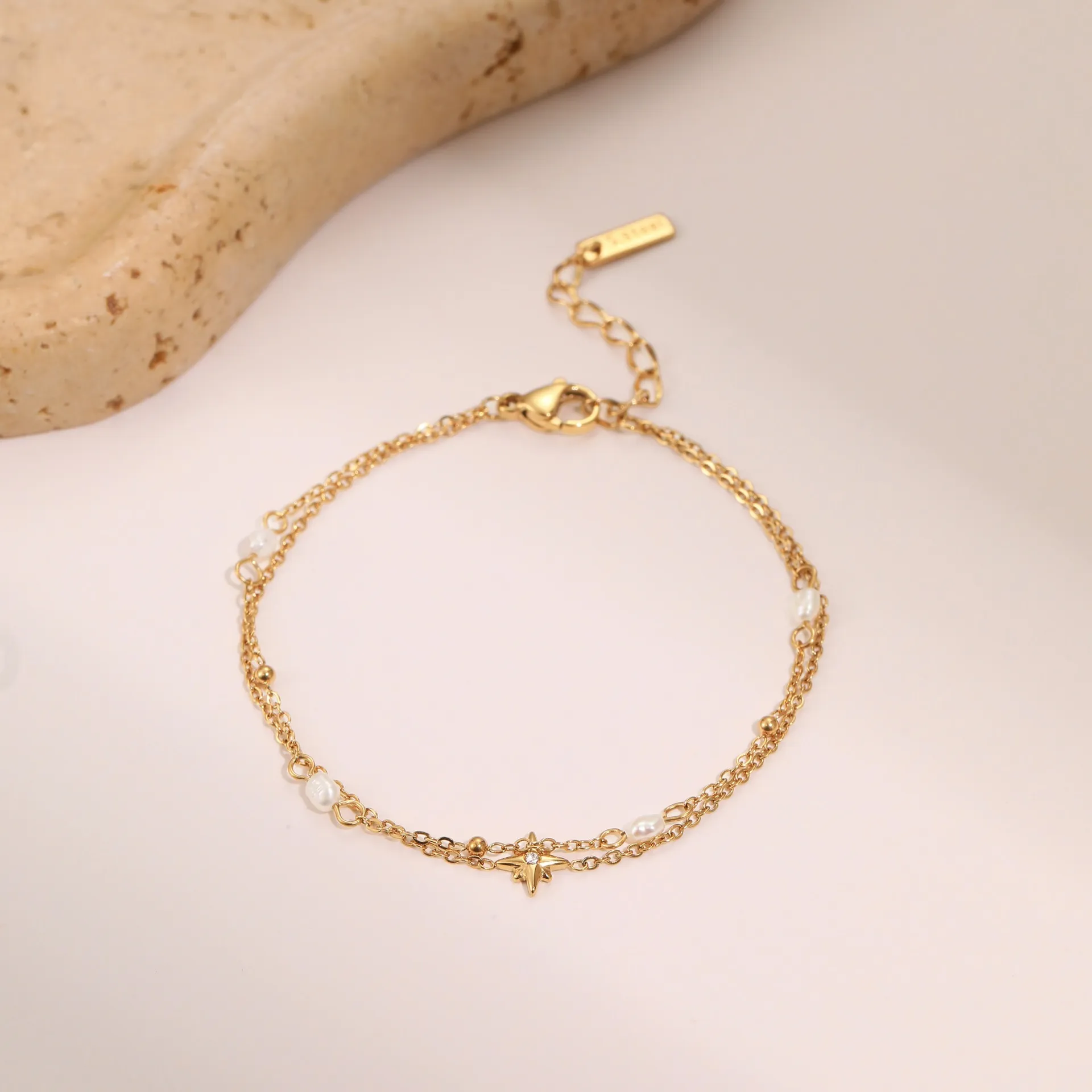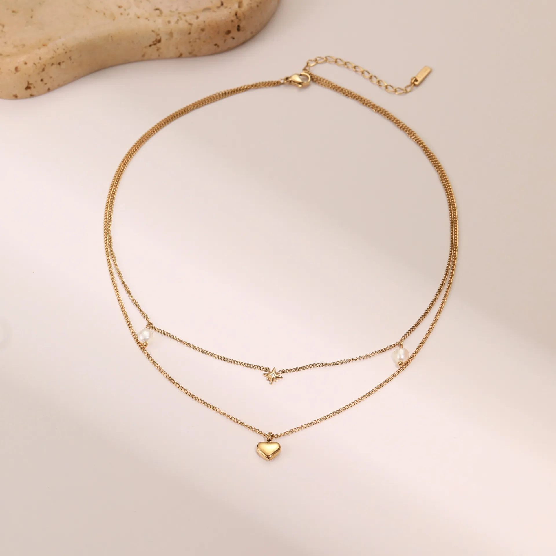 Double-layer Six-pointed Star Rhinestone Pearl Necklace – 18K Gold Plated INS Design