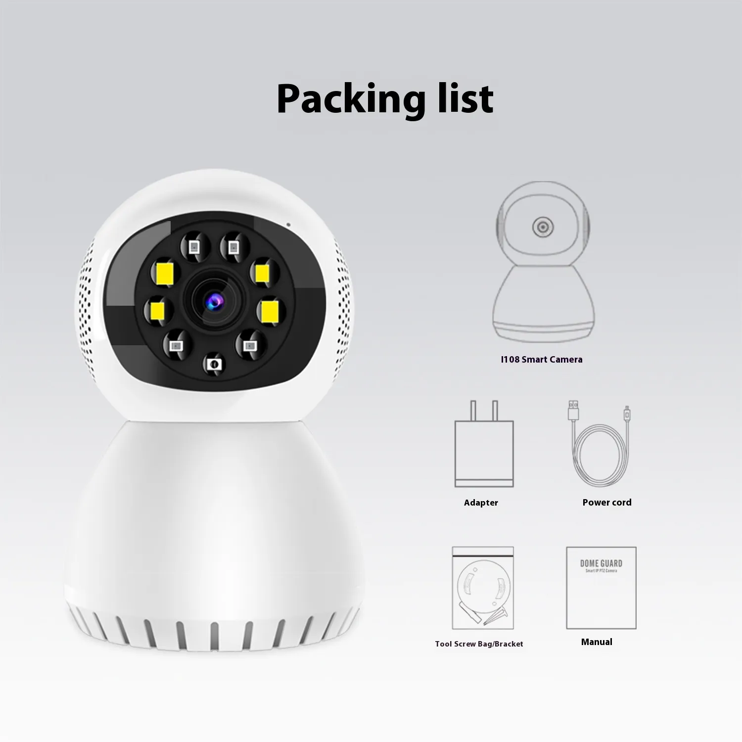 Intelligent camera * 1 Adapter * 1 Power cord * 1 Tool screw kit/bracket * 1 Instruction manual * 1