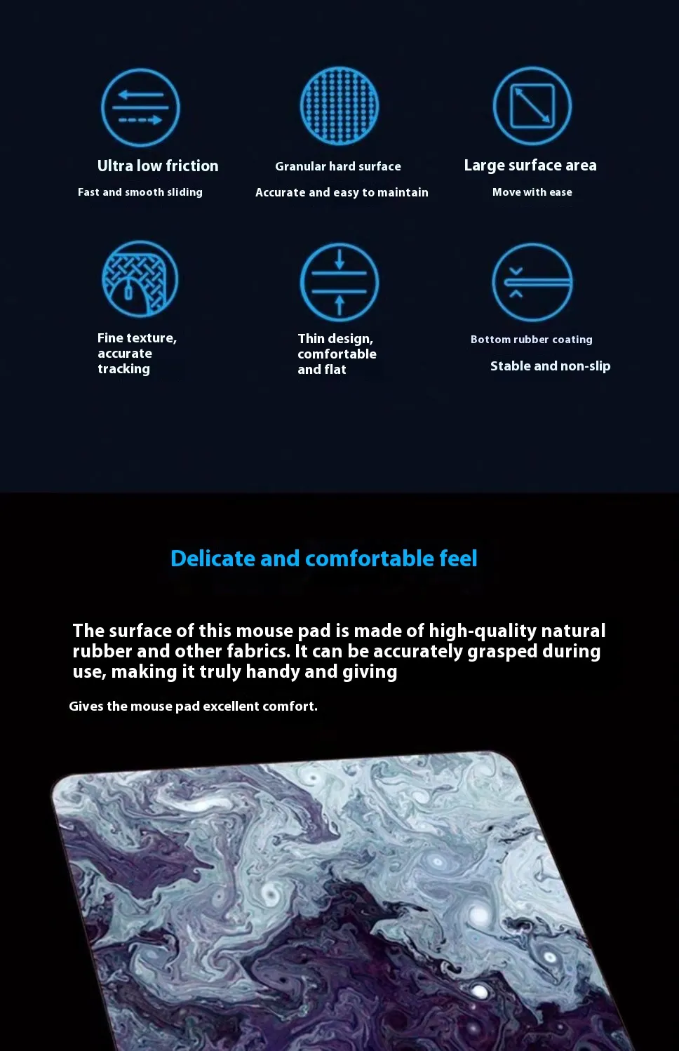 The fine rice noodles texture offers a soft yet firm surface for accurate mouse tracking, while the thickened structure ensures cushioning and wrist comfort during extended gaming sessions. The anti-slip base keeps the mouse pad securely in place on any table, preventing unwanted sliding and enhancing control. Its durable construction ensures long-lasting performance for all-day gaming.