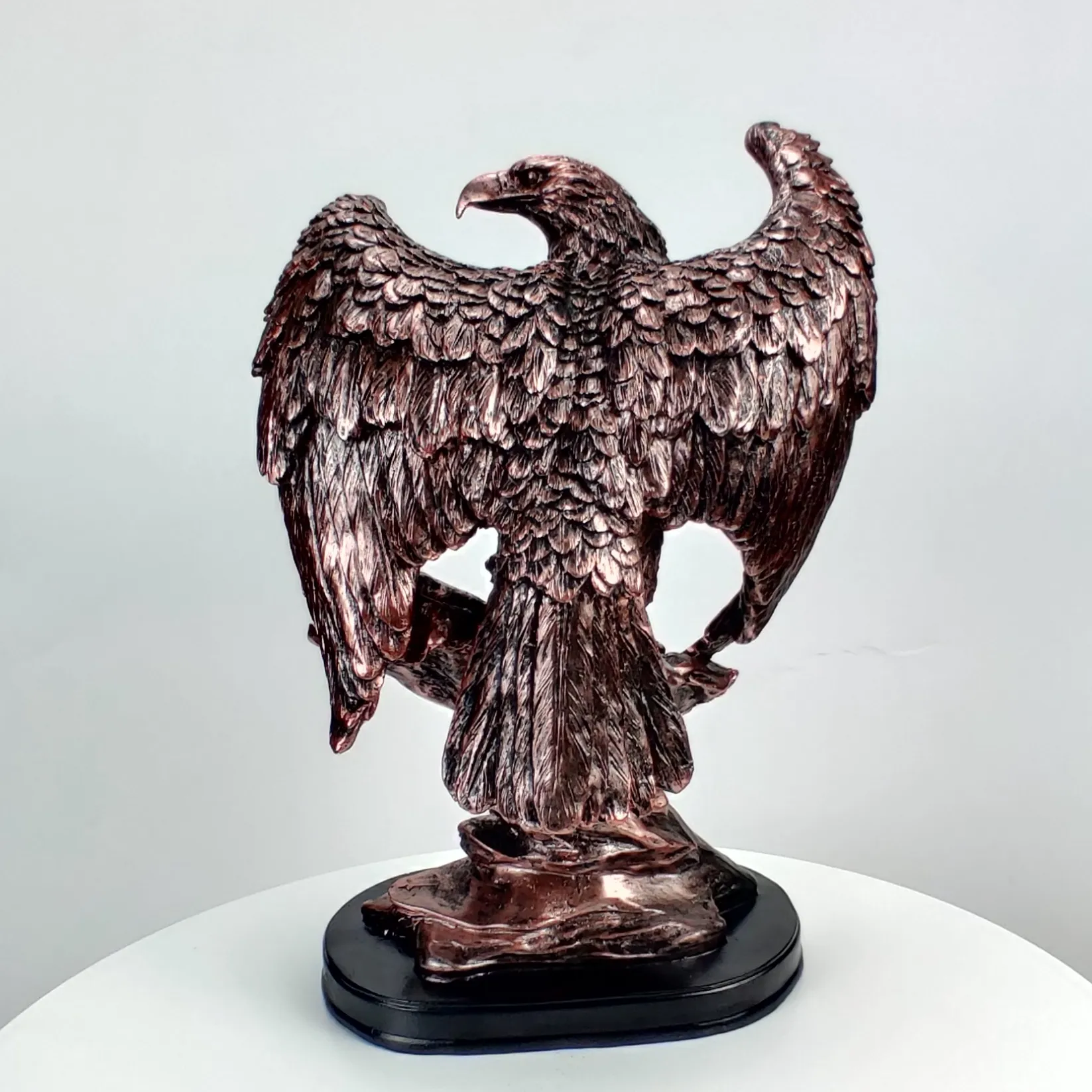 The eagle resin sculpture makes a striking addition to your living room or family room. Place it on a mantel, side table, or bookshelf to create a bold focal point that exudes elegance and strength.