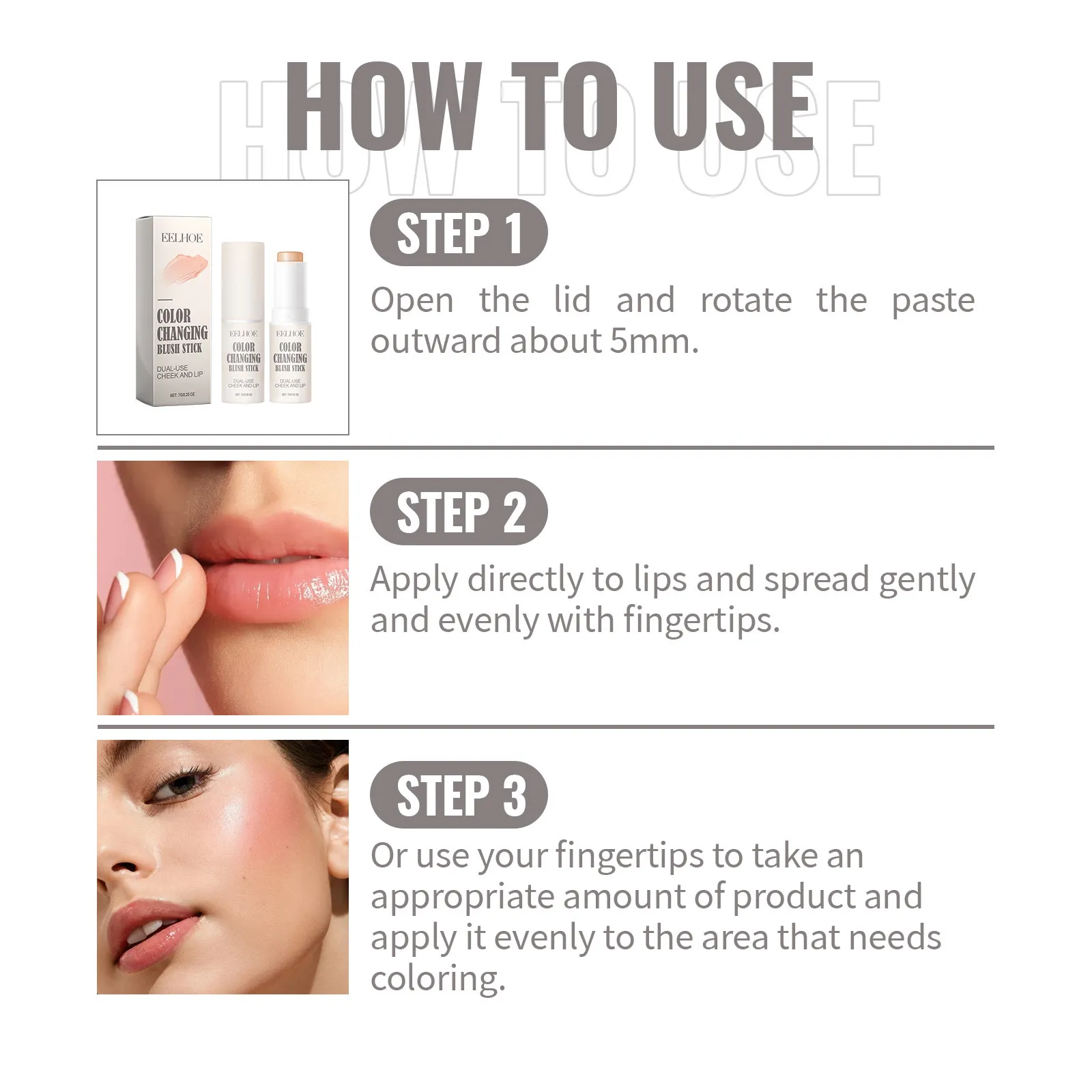 Color changing blush, dual-use blush stick, personalized blush, blush for cheeks and lips, EELHOE blush, pH-reactive blush, dewy blush, long-lasting blush, buildable blush, blush stick for lips, natural flush blush.