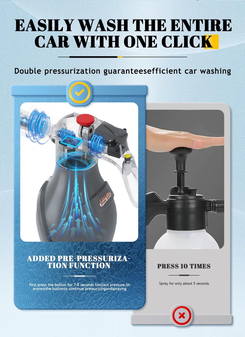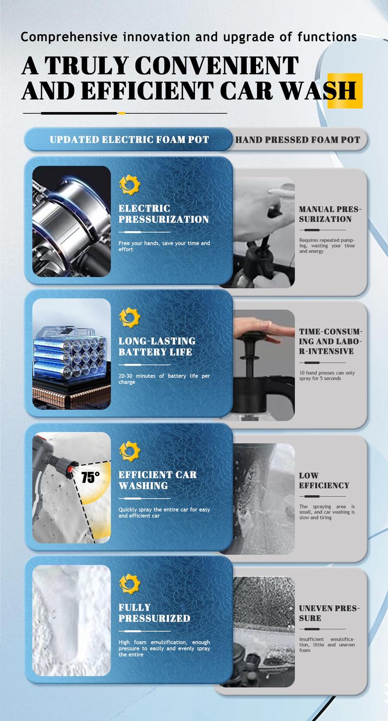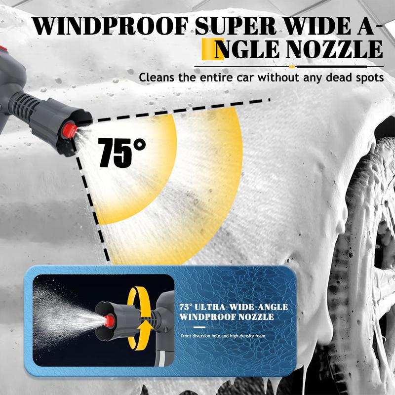 Powerful cleaning effect: Anti-fan-shaped nozzledesign, 75-degree ultra-wide angle, quickly and evenlycovers the entire car body, easy to cleanPowerful foam: Powerful electric double-pressurizedfoam design can produce rich and delicate foam, whichcan penetrate deeply into the car surface without deadends and effectively break down dirt.