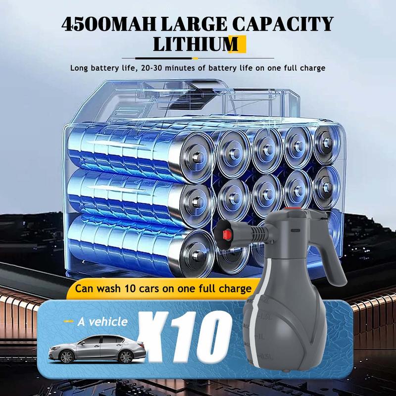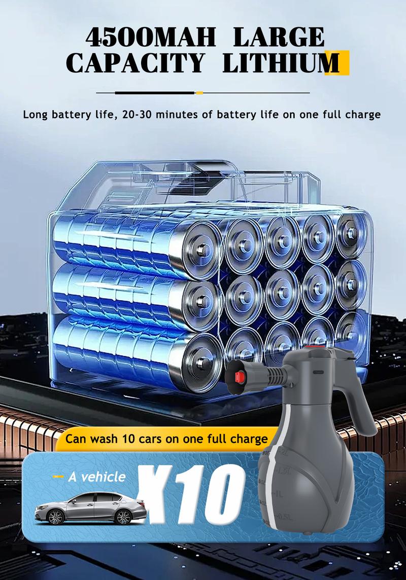 - Electric Pressurization: This electric foam sprayer comes equipped with an efficient pressurization system and a 1300mAh battery, ensuring continuous, powerful spray performance for all your cleaning needs.
