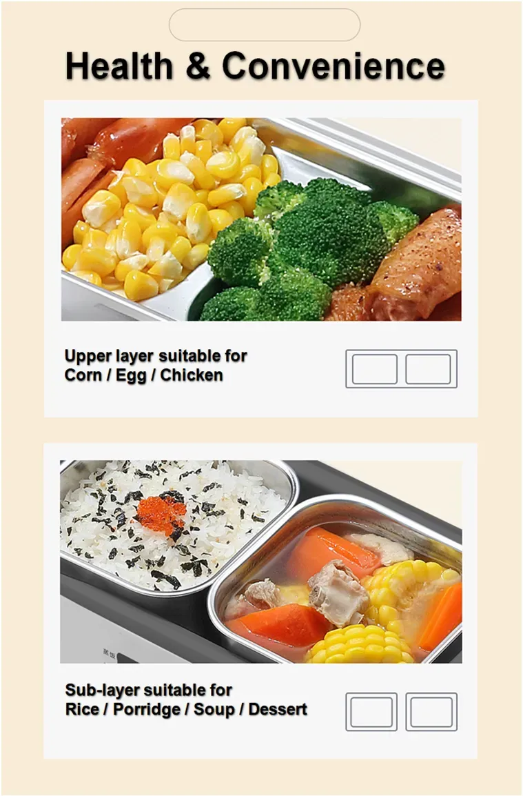 A single layer electric heating lunch box features a large, single compartment that is perfect for heating one dish or a simple meal. This design is ideal for individuals who prefer a straightforward, easy-to-use solution. The single-layer lunch box is compact and portable, making it a great option for those who need a convenient way to warm their lunch or dinner on the go.
