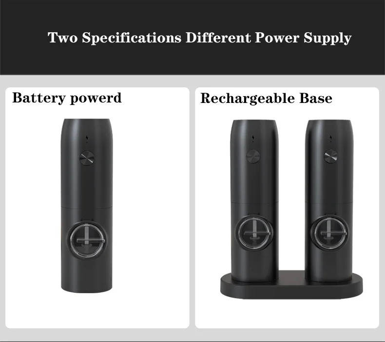 Instead of battery operated, this automatic pepper grinder set comes with a recharging station. It saves your time of changing batteries and the station make it possible to organise and charge your 2 pack salt and pepper set at the same time. And the working noise in under 60DB, which making your kitchen a neat and quiet place.