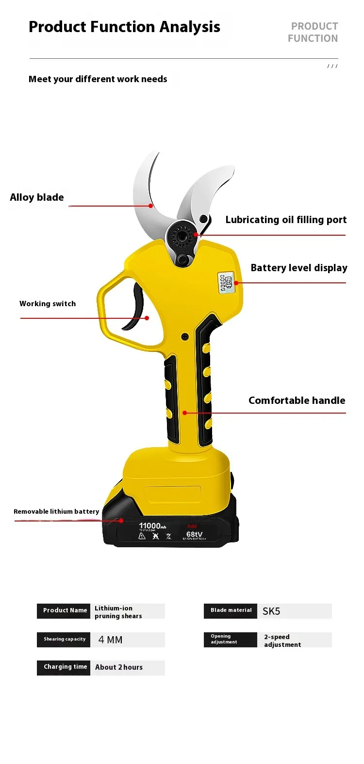 User-Friendly Design: Featuring ergonomic handles, lightweight construction, and simple controls, our electric secateurs