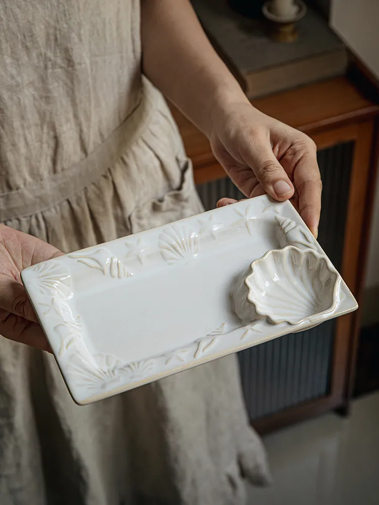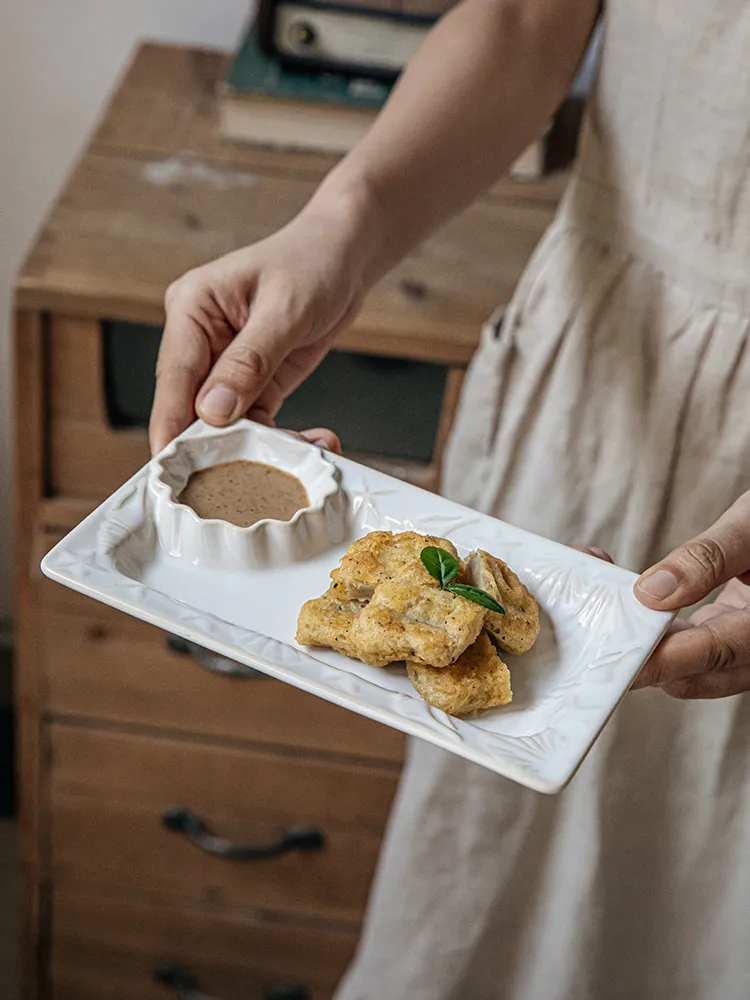 Embossed Shell Ceramic Dumpling Plate With Vinegar Dish