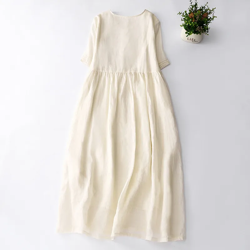 Embroidered Cotton and Linen Solid Color Beige V-Neck Dress