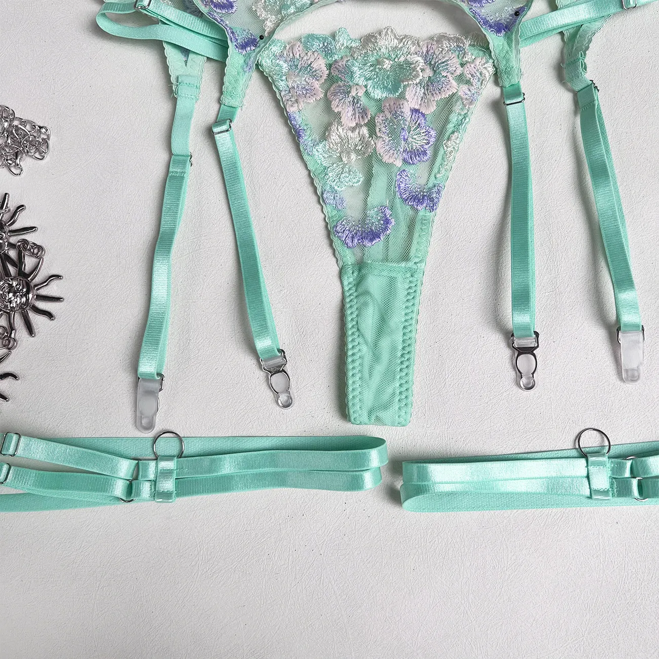 embroidered lace lingerie, lace-up suspender set, luxury lingerie set, seductive underwear, elegant lace lingerie, adjustable suspenders lingerie, sexy lace underwear, floral embroidered lingerie, romantic suspender set, sophisticated lingerie, women’s lace lingerie set.
