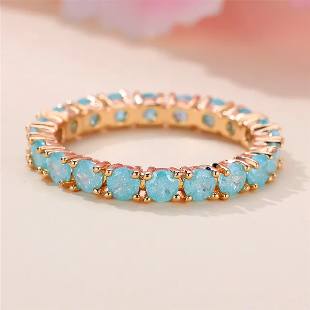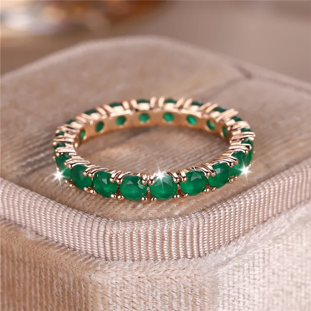Immerse yourself in the enchanting allure of the Enchanted Gem Eternity Band. This exquisite ring is a true masterpiece, featuring a continuous row of vibrant gemstones set in a lustrous gold-tone band. Available in three mesmerizing gemstone options—serene aquamarine, vibrant emerald green, and delicate rose quartz—this ring is designed to captivate and inspire.