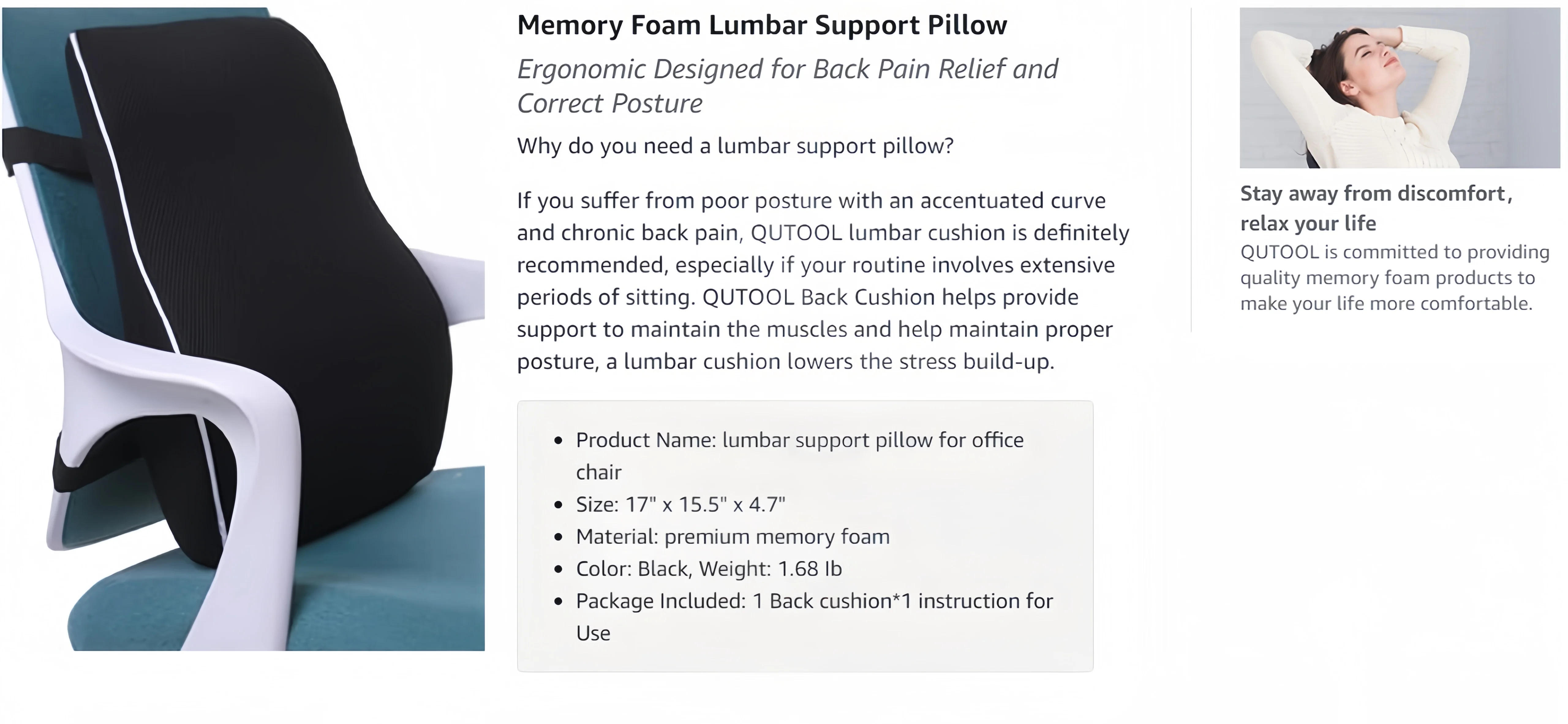 sitting. Designed with premium memory foam, this back cushion provides targeted support for your lower back, ensuring proper posture and