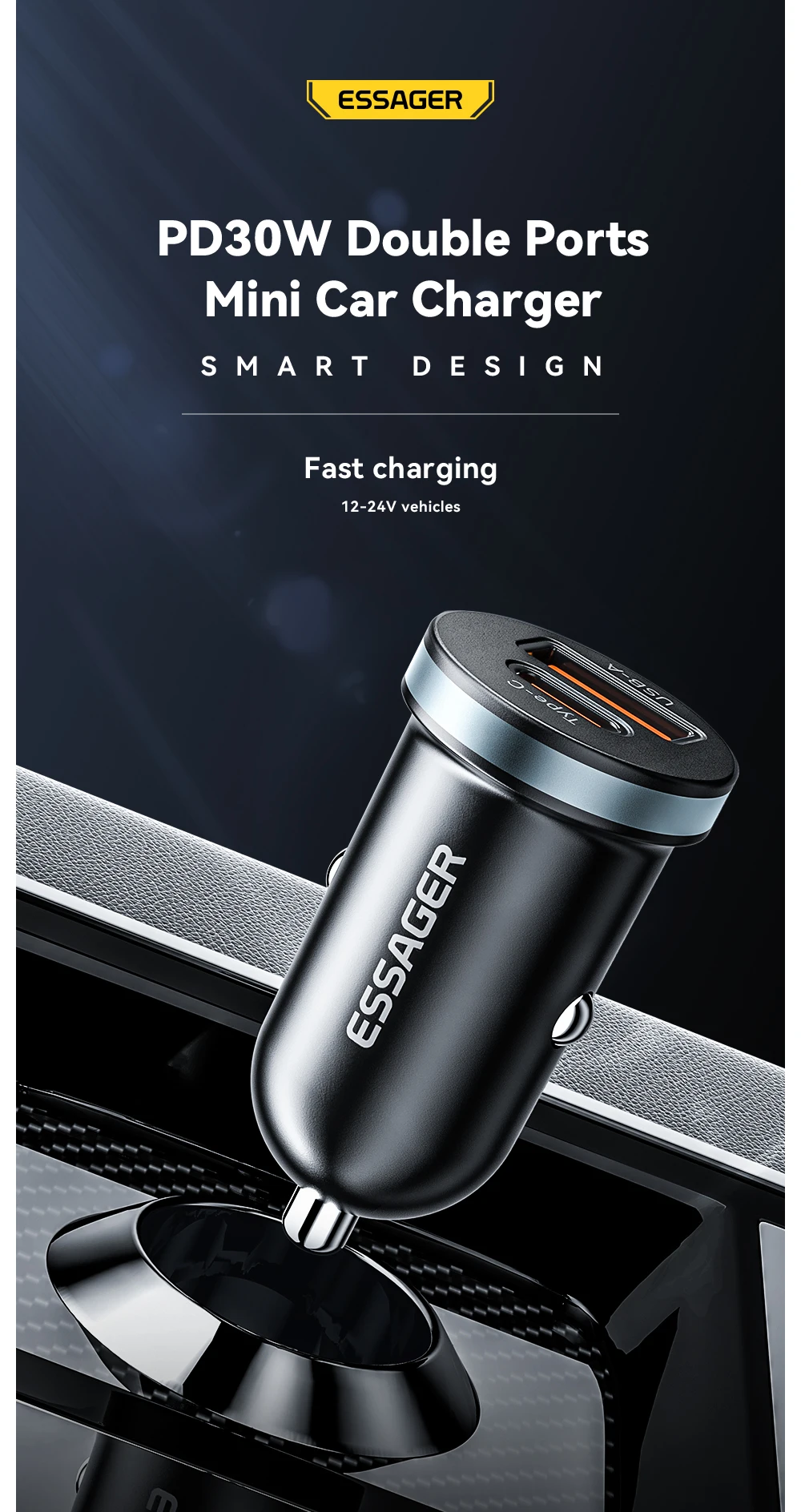 The Essager 30W USB car charger supports Quick Charge 4.0/3.0 and PD for rapid charging. Compatible with Xiaomi, iPhone 12, 13, 14 Pro, and other devices, it ensures fast and efficient charging on the go. Perfect for keeping your phone powered during travel.