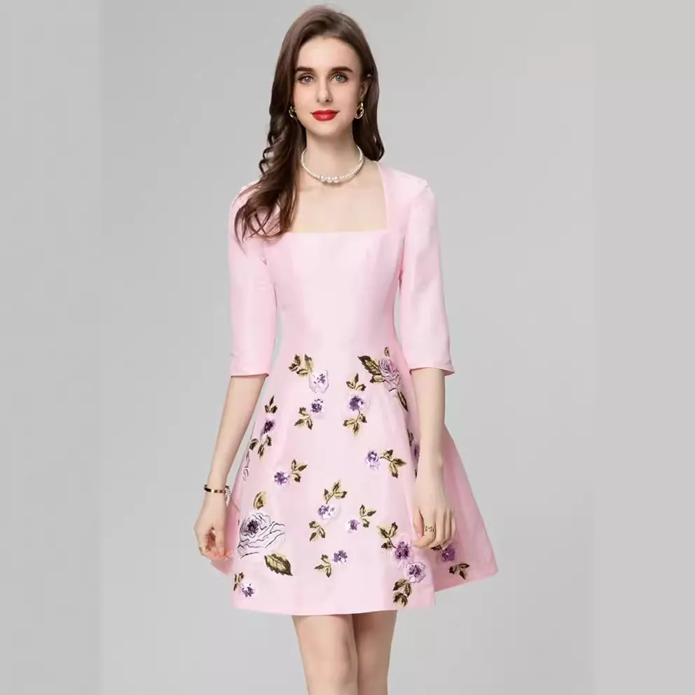 Exquisite Embroidered Flowers Half Sleeve Skirt Dress