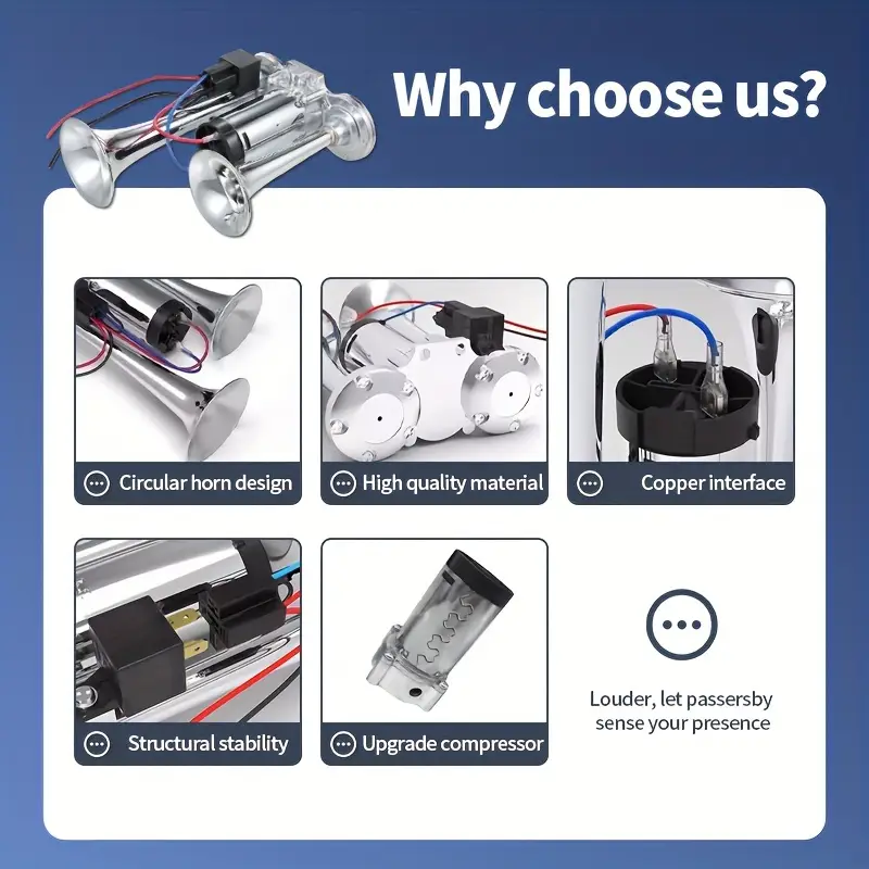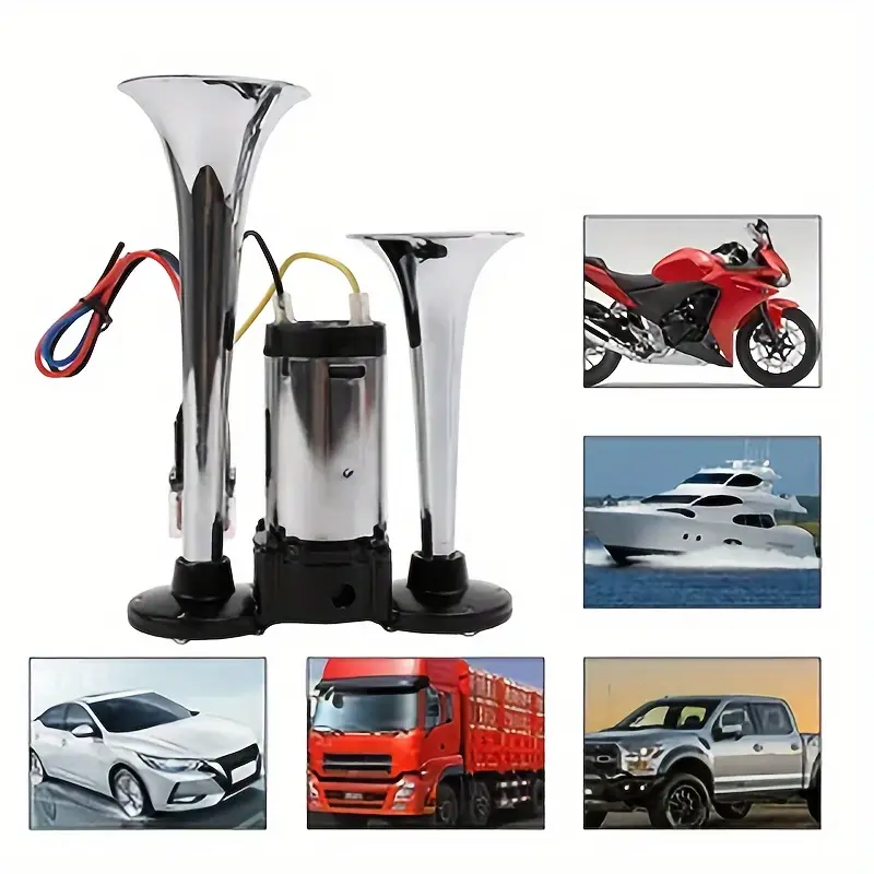The air horn features a dual horn powered by an air compressor, made from enhanced materials for durability. Product Name: Silver Double Tube Whistle. Material: Metal. Color: Silver. Functionality: 12V. Power Source: Electrical/Hardwired. Application: Designed for 12V vehicles with batteries, including trucks, ships, trains, cars, sedans, trams, and modified vehicles.Enhance the internal parts of the air compressor so that the horn can produce an extremely loud sound. Increase the thickness of the copper wire in the circuit. The transformer has been internally upgraded to better suit 12v vehicles, stabilizing the current and allowing for maximum current release to amplify the sound.Enhance the standard metal at the base of the horn and the exterior of the air compressor by using zinc alloy. This way, the speaker significantly prolongs its lifespan.'%3E%3Crect x='0' y='0' width='1024' height='1024' fill='%2348464c'/%3E%3Cg transform='scale(4.00) translate(0.5 0.5)'%3E%3Cg transform='translate(174.85 244.13) rotate(203.59) scale(24.31 106.84)'%3E%3Cellipse fill='%23adc0ca' fill-opacity='0.50' cx='0' cy='0' rx='1' ry='1'/%3E%3C/g%3E%3Cellipse fill='%23ffffff' fill-opacity='0.50' cx='51' cy='164' rx='32' ry='13'/%3E%3Cg transform='translate(122 147) rotate(268) scale(45 34)'%3E%3Crect fill='%23f2ffff' fill-opacity='0.50' x='-0.5' y='-0.5' width='1' height='1'/%3E%3C/g%3E%3Cg transform='translate(115.00 50.29) rotate(367.21) scale(118.40 25.08)'%3E%3Cellipse fill='%23050000' fill-opacity='0.50' cx='0' cy='0' rx='1' ry='1'/%3E%3C/g%3E%3Cg transform='translate(196 163) rotate(0) scale(40 20)'%3E%3Crect fill='%23ffffff' fill-opacity='0.50' x='-0.5' y='-0.5' width='1' height='1'/%3E%3C/g%3E%3Cellipse fill='%231b0000' fill-opacity='0.50' cx='32' cy='124' rx='72' ry='28'/%3E%3Cg transform='translate(199.43 111.42) rotate(280.19) scale(41.18 55.70)'%3E%3Cellipse fill='%231c100b' fill-opacity='0.50' cx='0' cy='0' rx='1' ry='1'/%3E%3C/g%3E%3Cellipse fill='%239ca6b3' fill-opacity='0.50' cx='173' cy='15' rx='255' ry='6'/%3E%3Cpolygon fill='%23ac9ba1' fill-opacity='0.50' points='139.41,135.07,118.25,167.82,95.15,101.95,148.62,72.64'/%3E%3Cellipse fill='%23000003' fill-opacity='0.50' cx='140' cy='194' rx='29' ry='29'/%3E%3C/g%3E%3C/g%3E%3C/svg%3E)