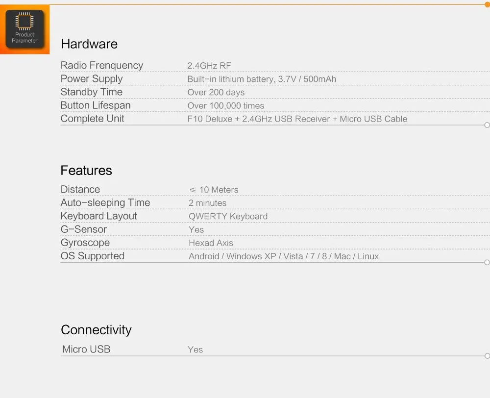 ◆Material : ABS + silikon◆Radiofrequenz: 2,4G Hz◆G-Sensor : Ja◆ Gyroskop : Ja◆Bulit-in batterie : 500 mAh◆ Tasten lebensdauer : > 100,0000 mal◆USB/fernbedienung betriebs strom (A) : 30mA/15mA◆Übertragung länge : 10 meter◆Standby-zeit (tag) : > 20 tage◆OS suppported : Windows XP/Vista/7/8/10/MAC/Linux/Android◆ IR Lernen Funktion : IR tasten auf der fernbedienung für Android box, Set-top-box, und TV◆Tastatur layout : QWERTY (Englisch) Können angepasst werden zu verschiedenen nationalen sprachen◆ Funktion tasten : UDLR (Oben, Unten, Links, Rechts), die volumen zu addieren und subtrahieren, rückkehr, die wichtigsten menü etc.◆Features:: "◆ Wireless (RF 2,4G) anschluss, smart & tragbare größe◆Zu genießen PC multi-media unterhaltung zu hause◆Arbeit mit Android box, Smart TV◆Zu teilen große TV und Projektor bildschirm◆ Perfekte kontrolle unterhaltung eigenschaften◆Tragbare, elegant & lifestyle wahl◆Air maus mit natürliche hand bewegungen.◆Die perfekte tastatur touch kombination◆Bequem und effizient für konferenz, Präsentation & vortrag"◆ Zubehör :1 * F10 Deluxe1 * Quick Start Guide1 * Micro USB kabel1 * USB empfänger dongleProdukt Beschreibung