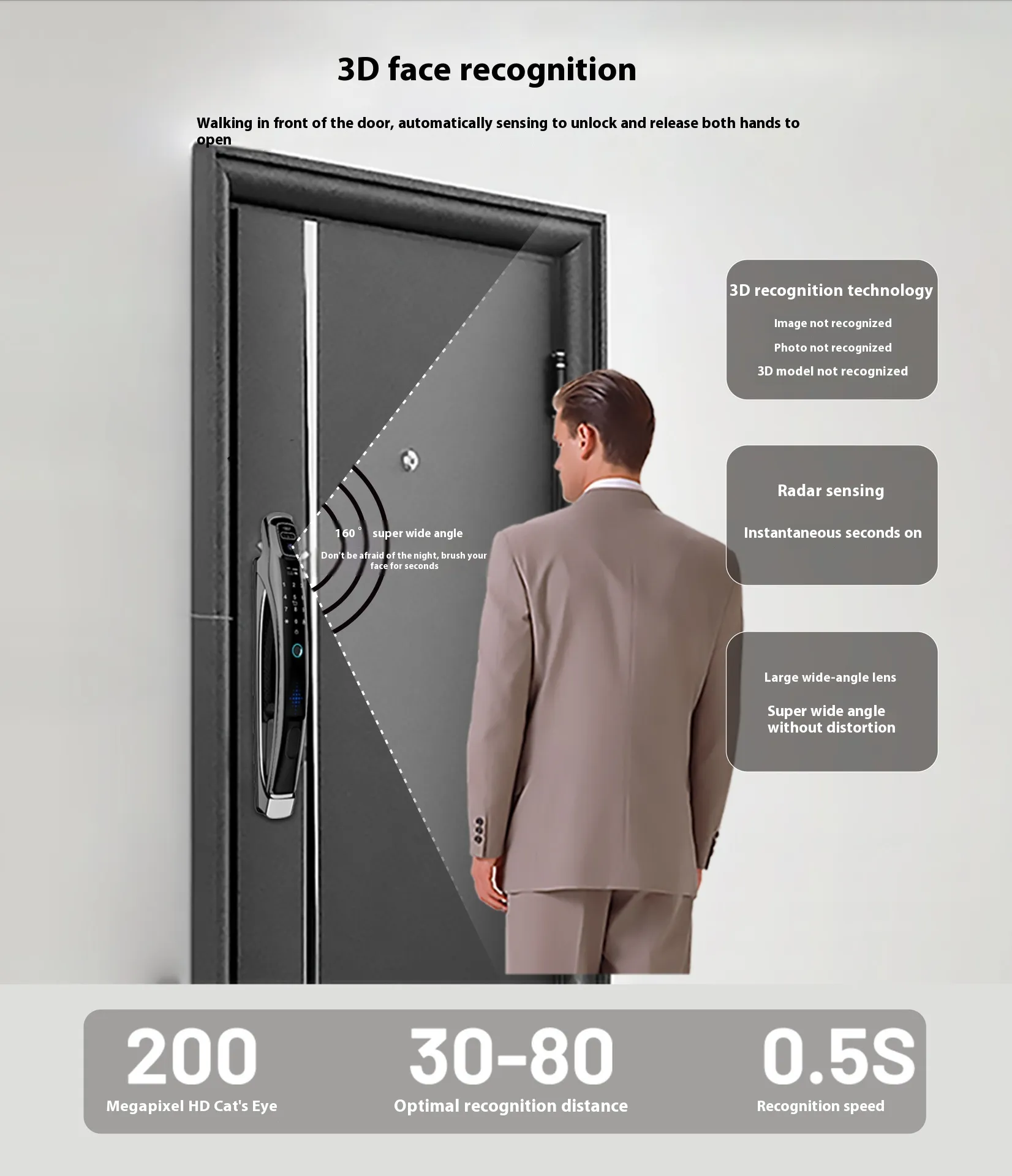 For added versatility, the lock also features intelligent fingerprint recognition. Simply scan your fingerprint to unlock the door, making access even quicker and more secure. This dual-mode security system gives you the flexibility to choose between face recognition or fingerprint access, depending on your preferences or security needs.