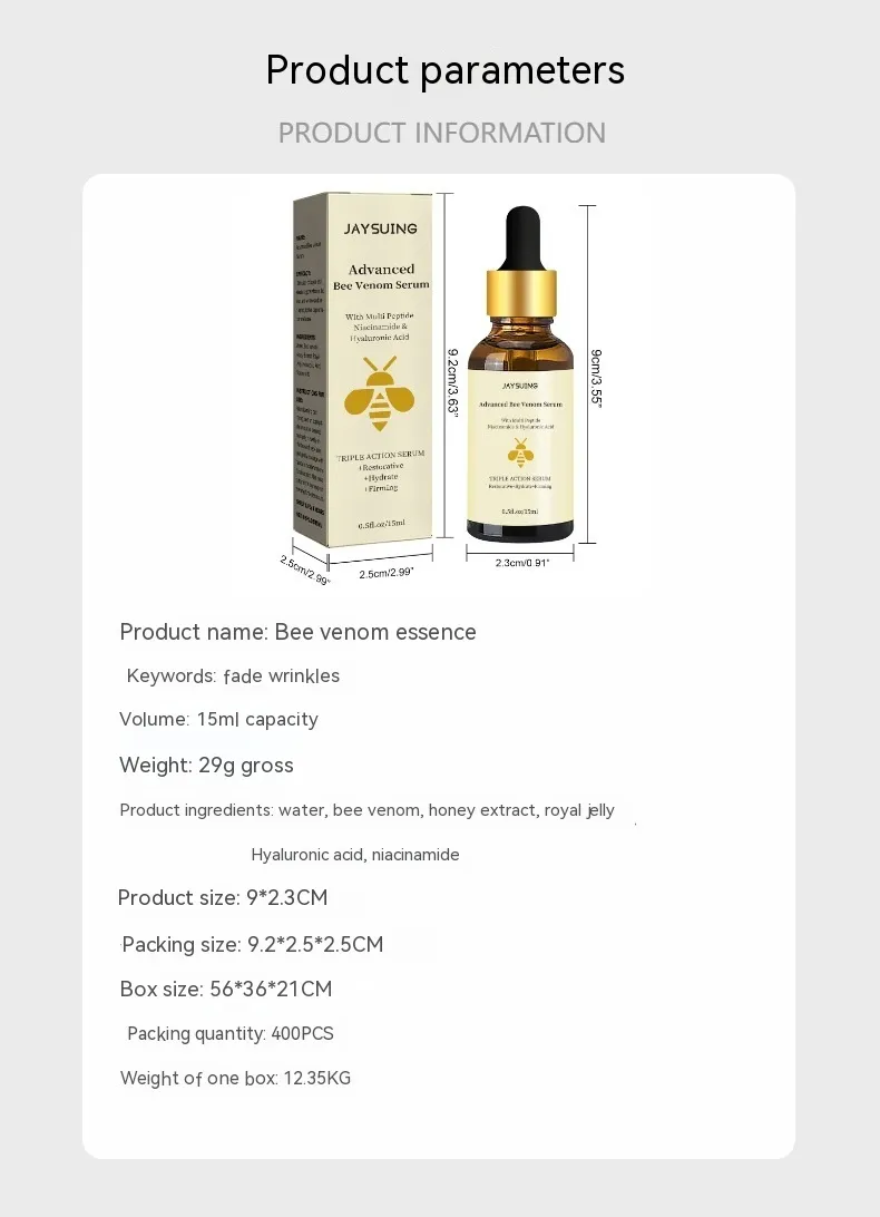 Overall, the Facial Bee Venom Essence Serum delivers a focused approach to skin revitalisation. It combines advanced cosmetic formulation principles with ease of use, supporting visible improvements in skin firmness, smoothness, and radiance through regular application.